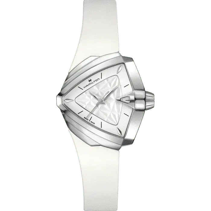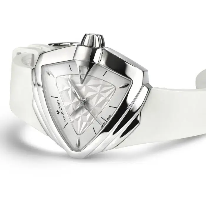 Più di cinquant’anni dopo, il primo orologio elettrico al mondo conserva un’estetica futuristica con la sua iconica cassa triangolare. Il Ventura S Quartz presenta un design ad effetto 3D su un quadrante nero o bianco completato da un cinturino in caucciù coordinato.