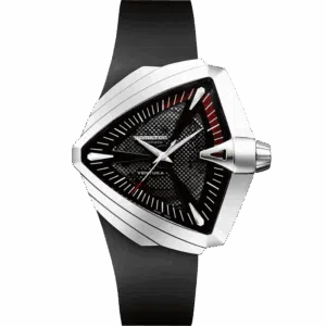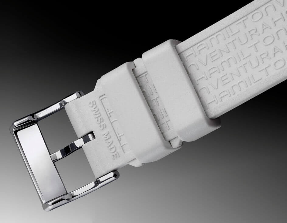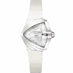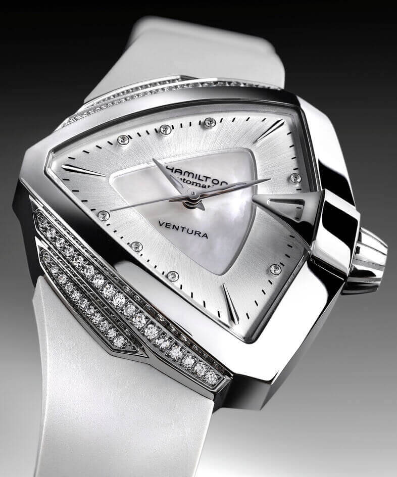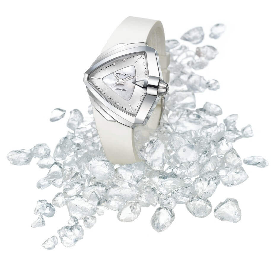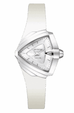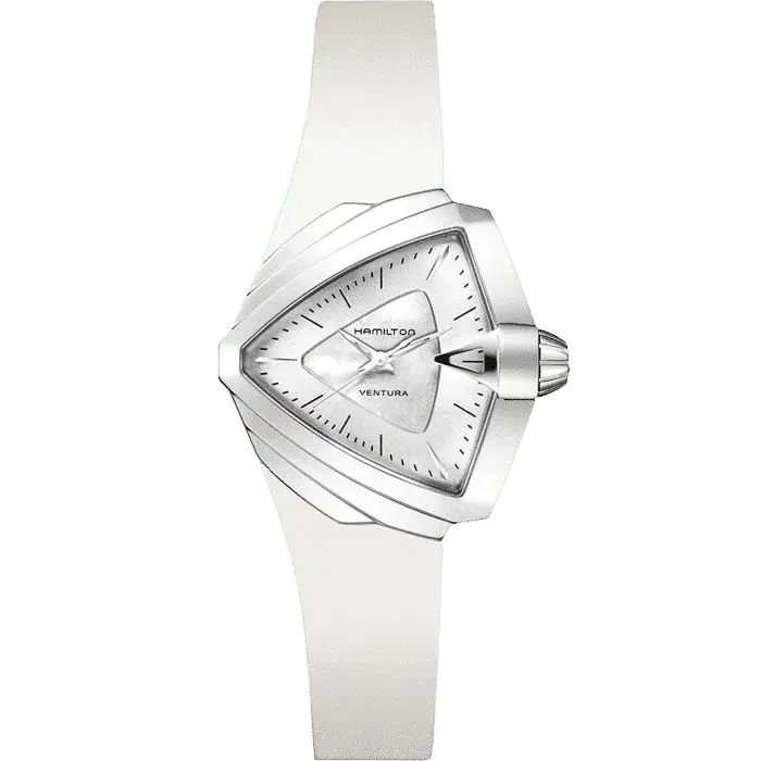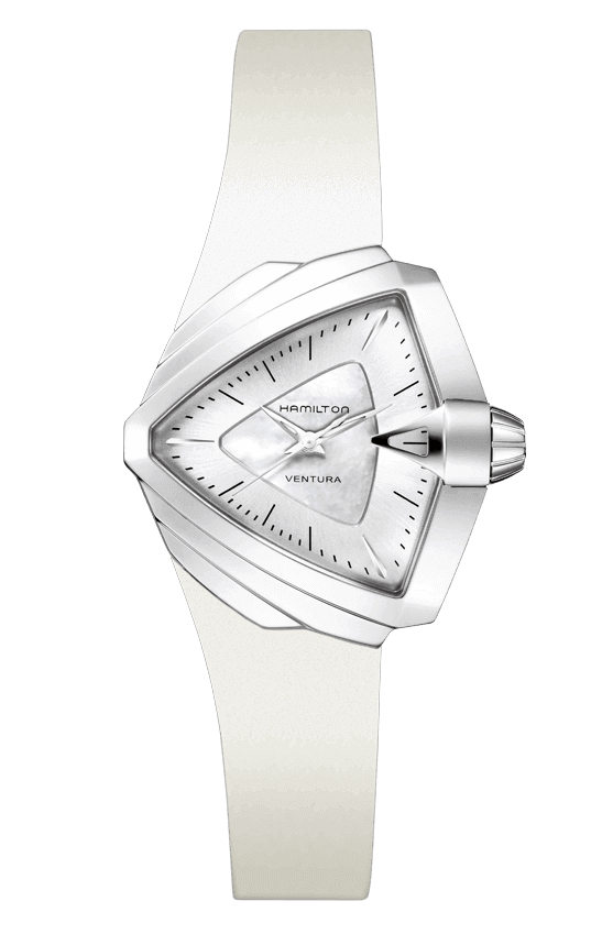 Il Ventura originale, presentato nel 1957, passò alla storia dell’orologeria come il primo orologio elettrico a batteria al mondo. Con il suo design unico e audace, divenne rapidamente un’icona e un oggetto da collezione. L’ultima interpretazione del Ventura è un fedele tributo all’originale e richiama la pionieristica forma a scudo della cassa, esempio di design moderno “Mid-Century”. Questa versione bianca e madreperla, piccola ma dalle proporzioni perfette, è stata progettata per donne dalla forte personalità.