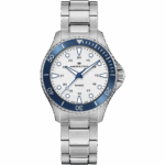 Esplora lo stile subacqueo con questo Khaki Navy Scuba Quartz. La sua incantevole lunetta blu, che brilla su un quadrante bianco e protegge l’orologio da elementi corrosivi come sabbia e sale, lo rende l’accessorio perfetto per l’estate.