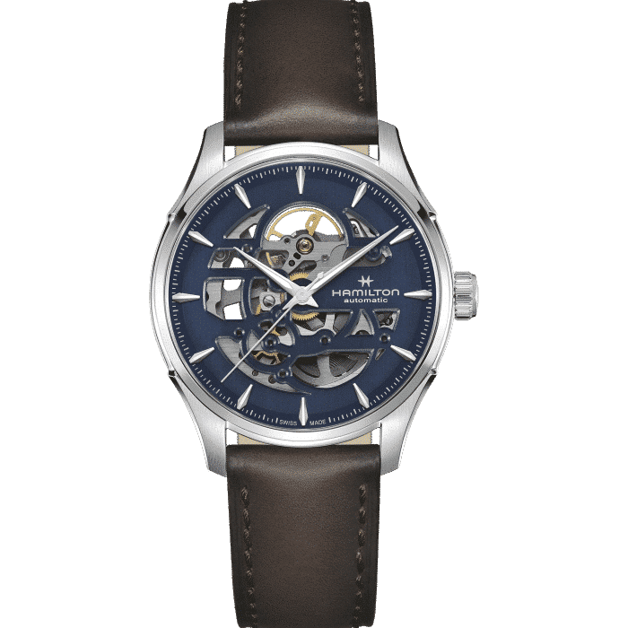Il Jazzmaster Skeleton 36 mm, con il suo quadrante traforato blu, punta tutto sulla precisione e rivela al contempo la raffinata bellezza del movimento meccanico al suo interno. Mettendo in risalto il movimento automatico H-10, con una riserva di carica di 80 ore e spirale in Nivachron™, il Jazzmaster Skeleton vanta un sofisticato cinturino in pelle marrone, che incarna il savoir-faire in continua evoluzione di Hamilton e l’attenzione ai dettagli.
