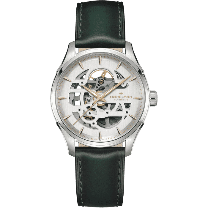 Il Jazzmaster Skeleton 40 mm, con il suo quadrante traforato argento, punta tutto sulla precisione e rivela al contempo la raffinata bellezza del movimento meccanico al suo interno. Mettendo in risalto il movimento automatico H-10, con una riserva di carica di 80 ore e spirale in Nivachron™, il Jazzmaster Skeleton vanta un sofisticato cinturino in pelle verde, che incarna il savoir-faire in continua evoluzione di Hamilton e l’attenzione ai dettagli.