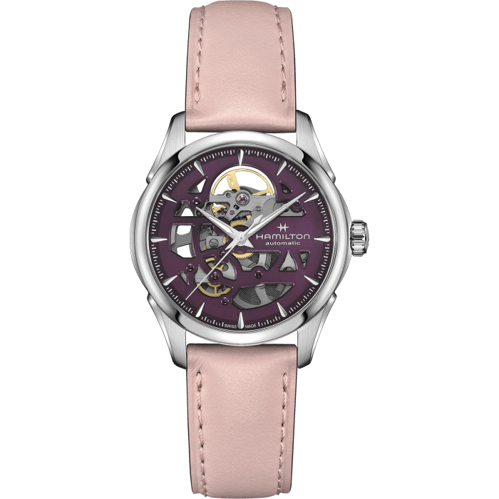 Il Jazzmaster Skeleton 36 mm, con il suo quadrante traforato viola, punta tutto sulla precisione e rivela al contempo la raffinata bellezza del movimento meccanico al suo interno. Mettendo in risalto il movimento automatico H-10, con una riserva di carica di 80 ore e spirale in Nivachron™, il Jazzmaster Skeleton presenta un delicato cinturino in pelle rosa, che incarna il savoir-faire in continua evoluzione di Hamilton e l’attenzione ai dettagli.