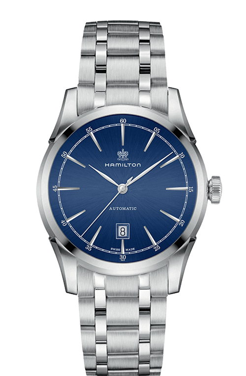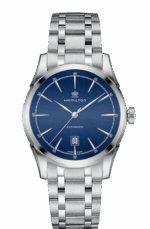 Bracciale in acciaio inossidabile e quadrante blu. Hamilton aggiunge un nuovo modello alla sua collezione Spirit of Liberty di orologi da polso. Orologio automatico con datario sulle ore 6.