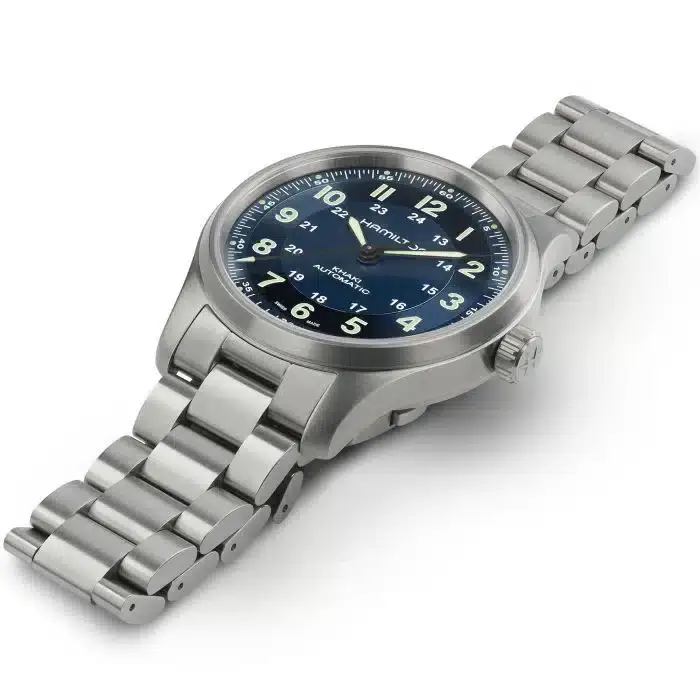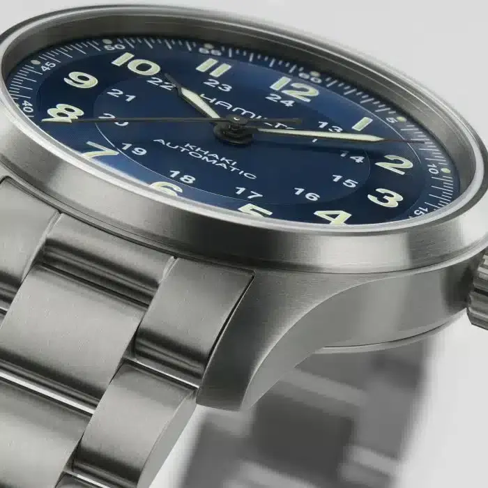 Caratterizzato da una cassa in titanio e bracciale, il Khaki Field Titanium 42 mm è un orologio altamente versatile, perfetto per essere indossato in ogni occasione. Il quadrante blu dall’ottima leggibilità ti permette di tenere i tempi di tutte le tue avventure, mentre il bracciale presenta una finitura spazzolata che aggiunge robustezza e carattere al design militare. Abbinando leggerezza e funzionalità allo stile militare, il Khaki Field Titanium è il tuo fedele alleato nella ricerca di nuove esperienze.