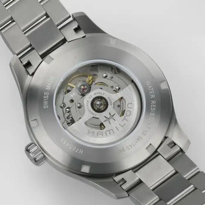 - Movimento a tre sfere con data e riserva di carica superiore di 80 ore, l’H-10 presenta elaborati motivi colimaçon e perlati a contrasto per i modelli American Classic e superfici pulite per gli orologi da pilota.
