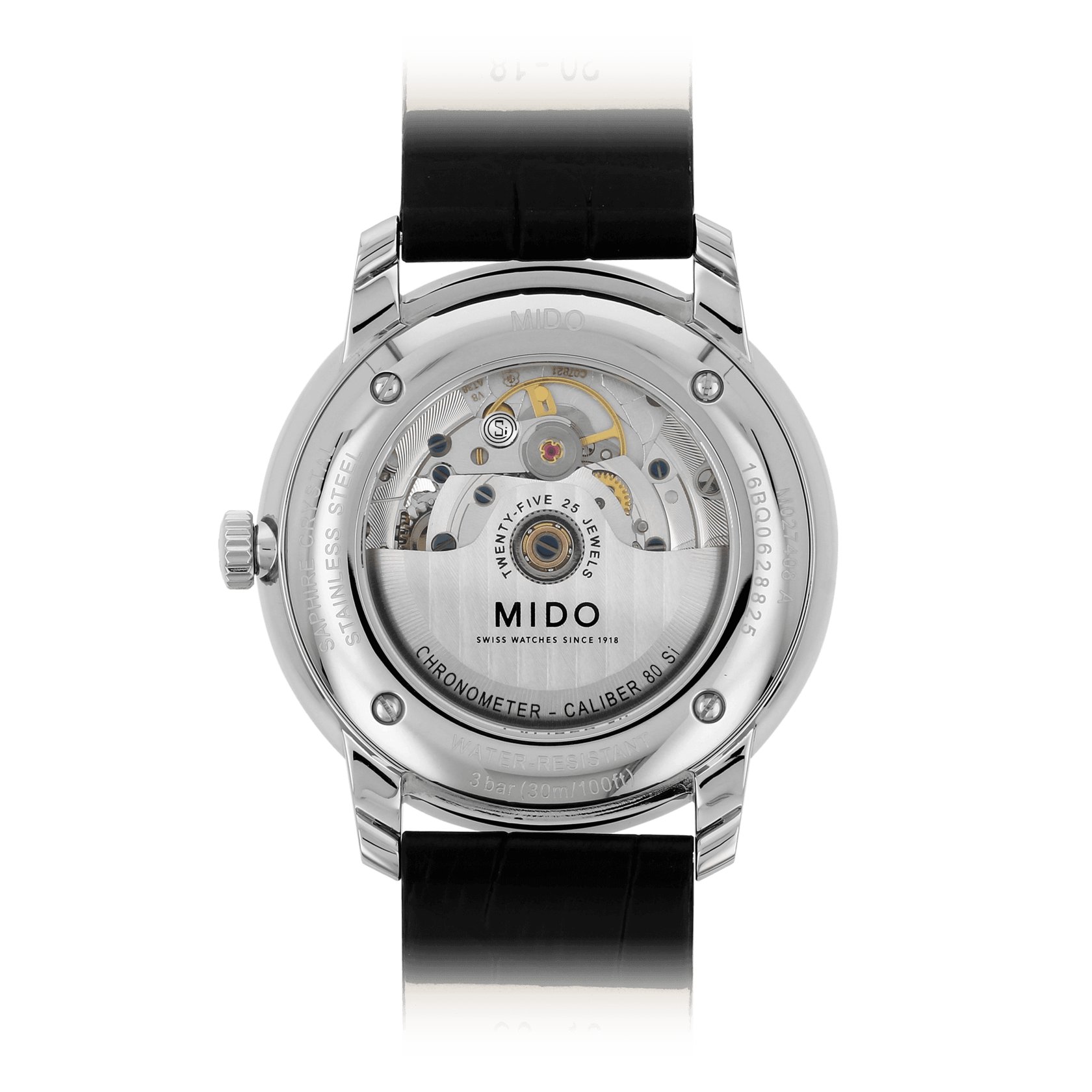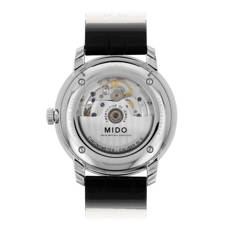 Il movimento MIDO Caliber 80 con cronometro di ultima generazione è dotato di una spirale in silicio. Oltre alle proprietà non amagnetiche, offre una maggior precisione e una resistenza agli urti maggiori. Assicura fino a 80 ore di autonomia.