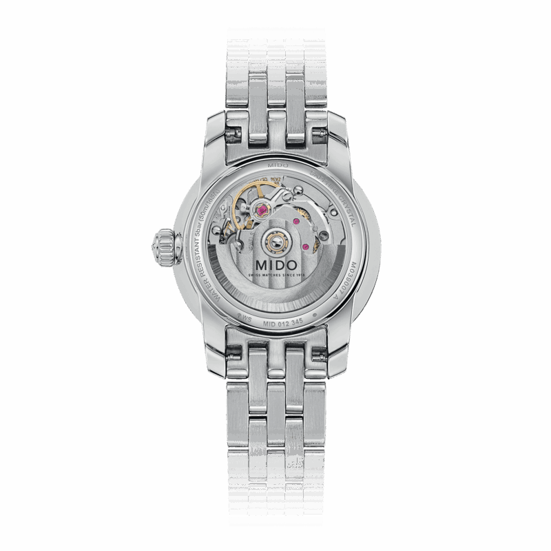 Conforme ai rigorosi criteri dell’orologeria, il movimento automatico MIDO testimonia le competenze del marchio. Si ricarica con i movimenti del polso, offrendo una riserva di carica continua. Dotato di componenti di alta qualità, è spesso finemente decorato e visibile attraverso il fondello trasparente.