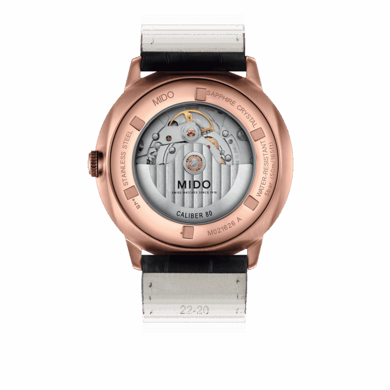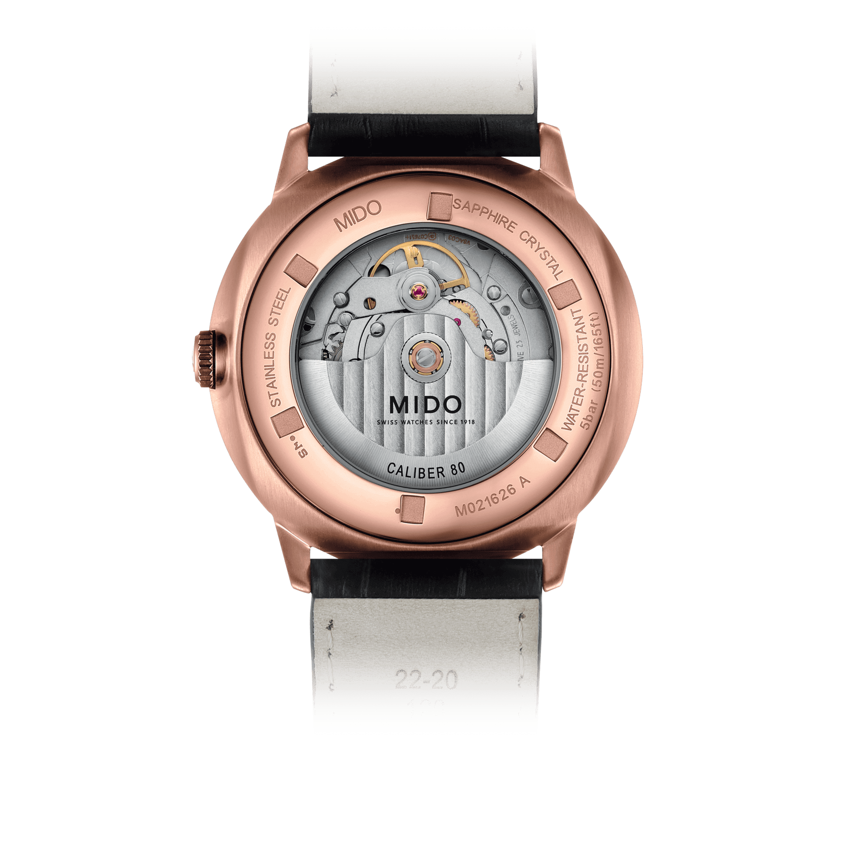 The MIDO Caliber 80 represents a major advance in self-winding movements. Thanks to its new-generation technology, it offers up to 80 hours of power reserve – twice as much as a conventional movement.