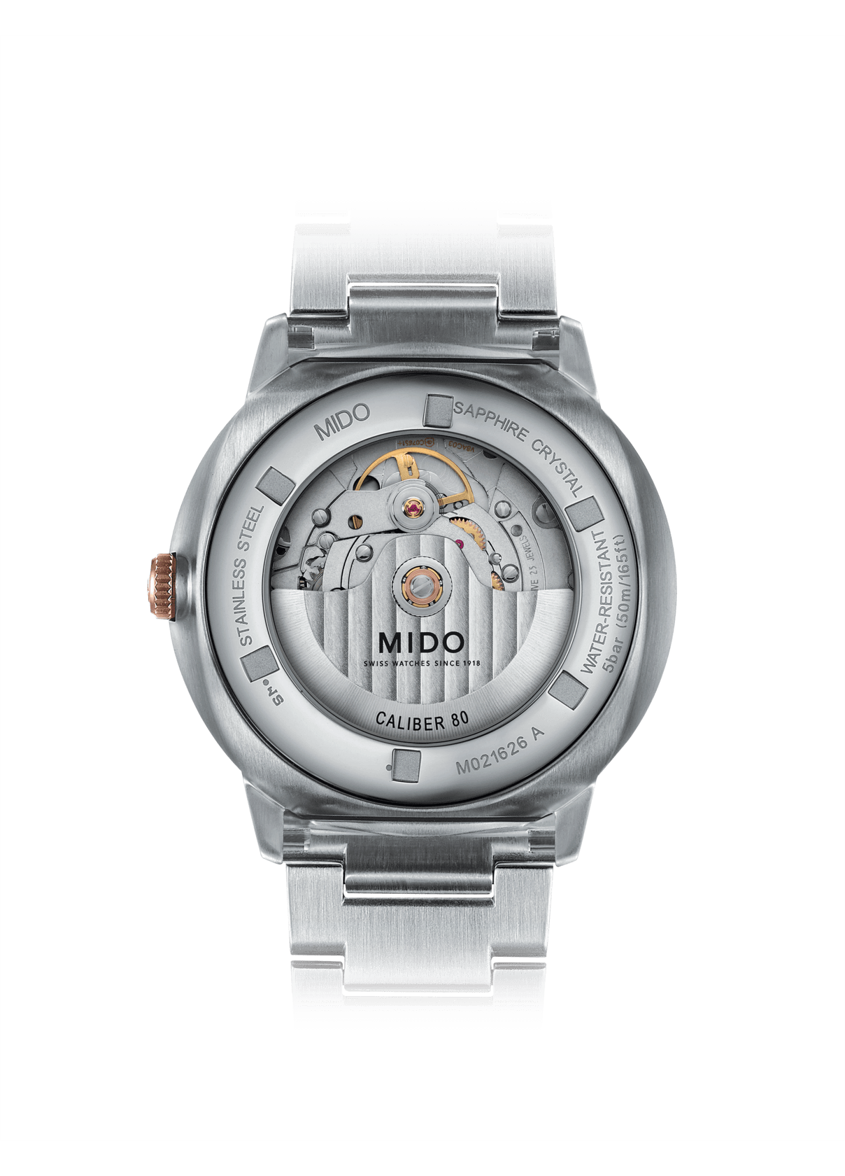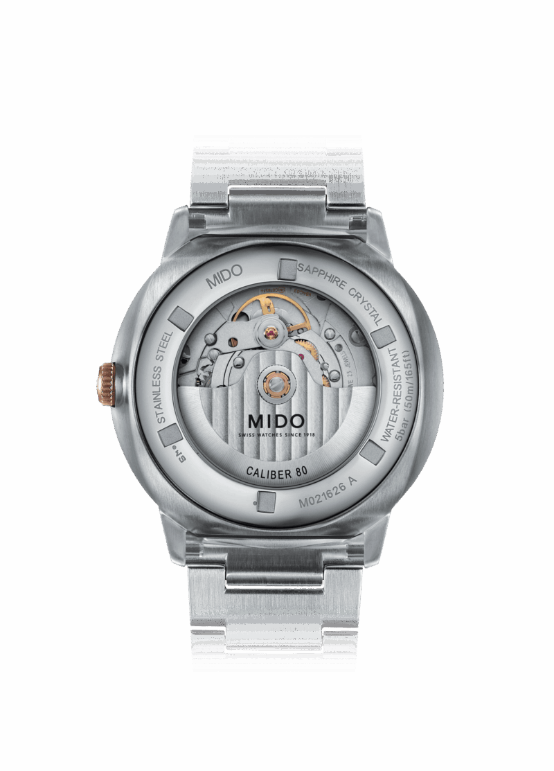 The MIDO Caliber 80 represents a major advance in self-winding movements. Thanks to its new-generation technology, it offers up to 80 hours of power reserve – twice as much as a conventional movement.
