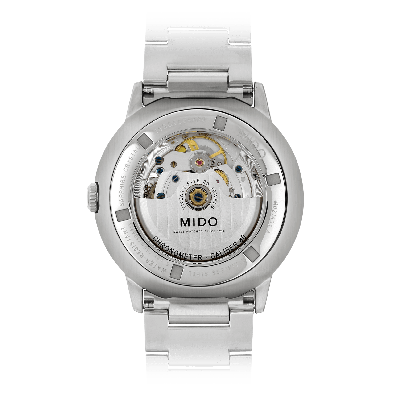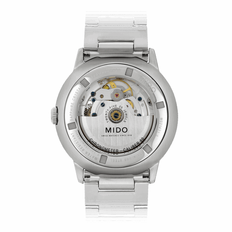 Il movimento MIDO Caliber 80 con cronometro di ultima generazione è dotato di una spirale in silicio. Oltre alle proprietà non amagnetiche, offre una maggior precisione e una resistenza agli urti maggiori. Assicura fino a 80 ore di autonomia.