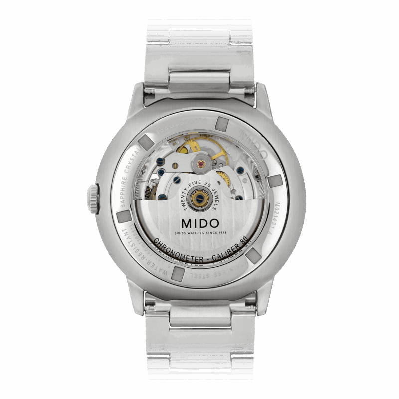 Il movimento MIDO Caliber 80 con cronometro di ultima generazione è dotato di una spirale in silicio. Oltre alle proprietà non amagnetiche, offre una maggior precisione e una resistenza agli urti maggiori. Assicura fino a 80 ore di autonomia.