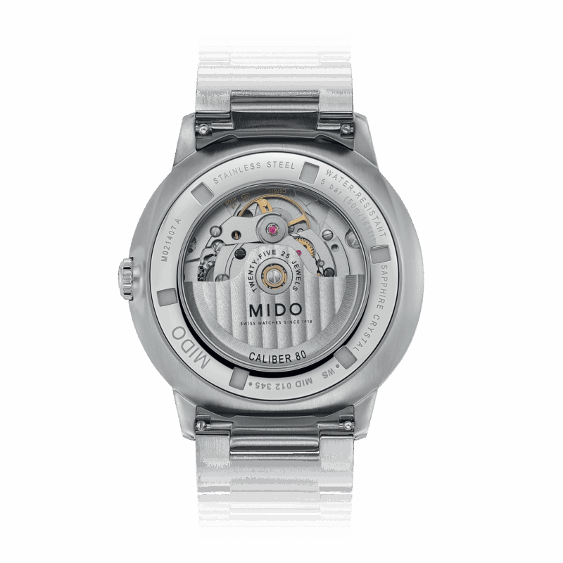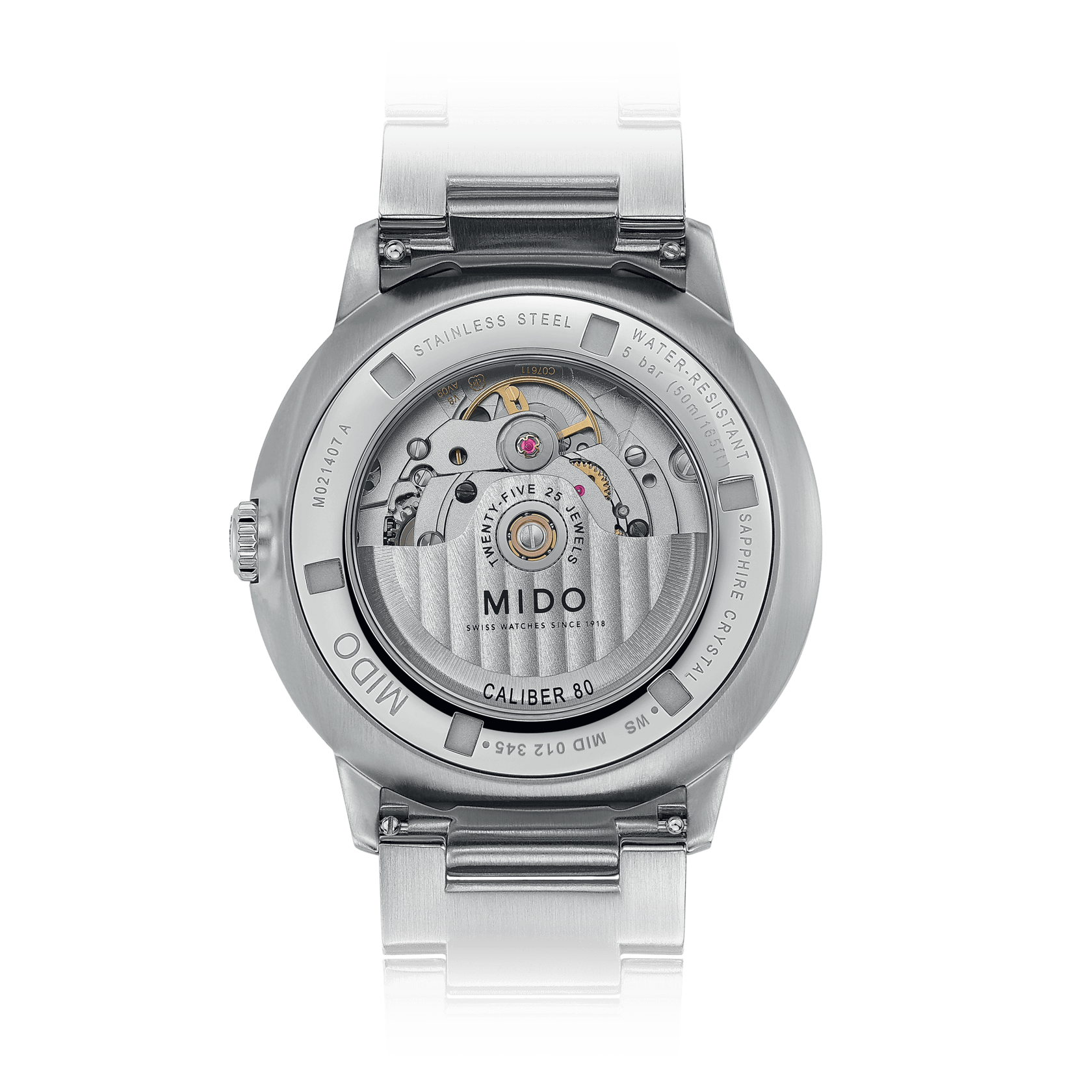 The MIDO Caliber 80 represents a major advance in self-winding movements. Thanks to its new-generation technology, it offers up to 80 hours of power reserve – twice as much as a conventional movement.