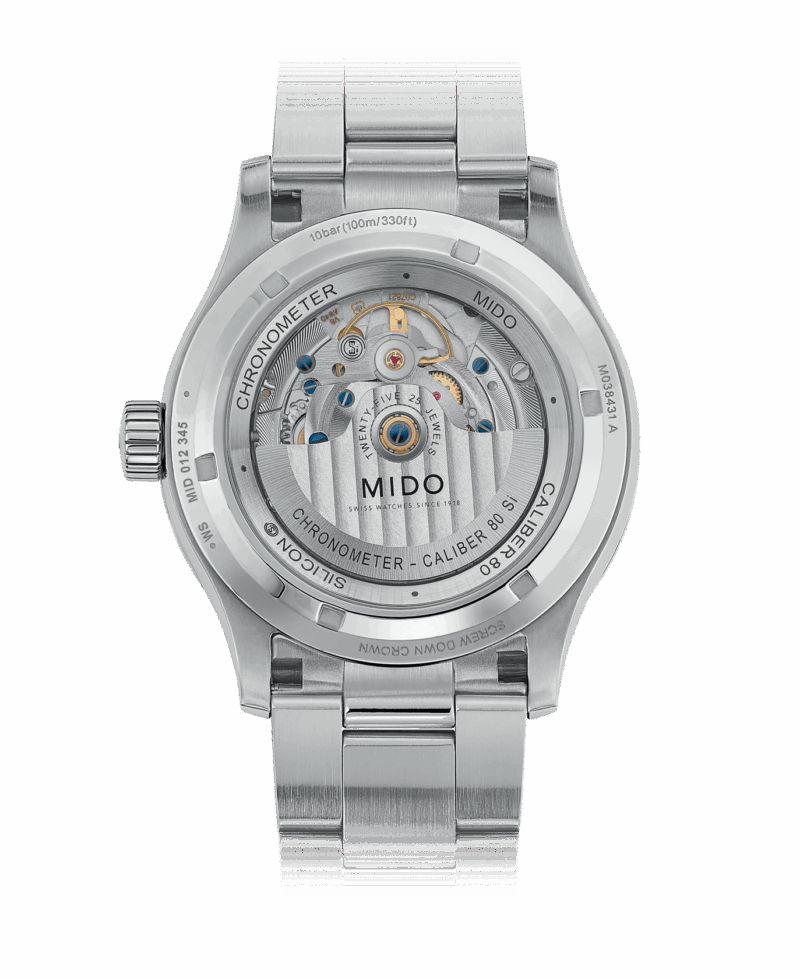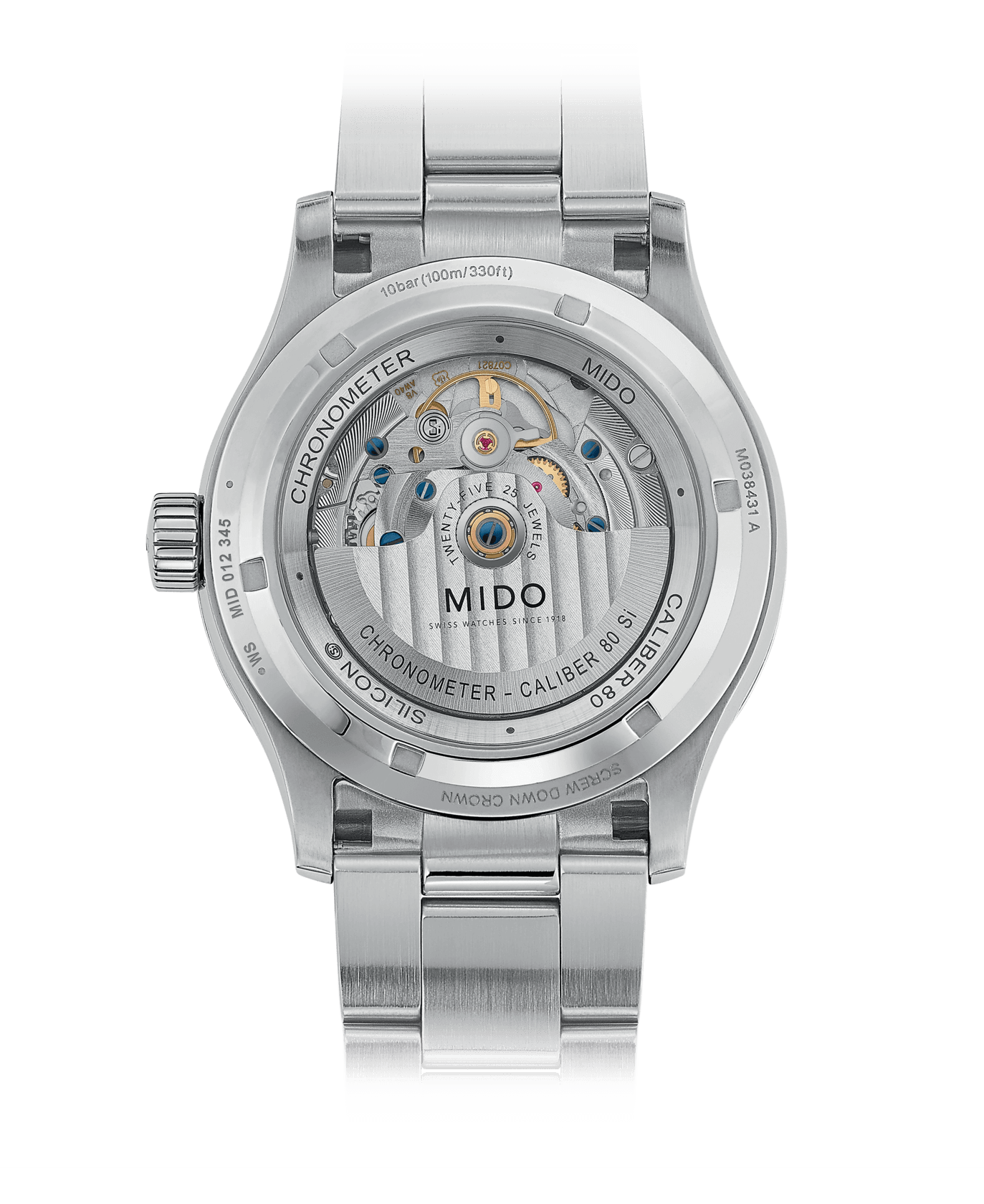 Il movimento MIDO Caliber 80 con cronometro di ultima generazione è dotato di una spirale in silicio. Oltre alle proprietà non amagnetiche, offre una maggior precisione e una resistenza agli urti maggiori. Assicura fino a 80 ore di autonomia.