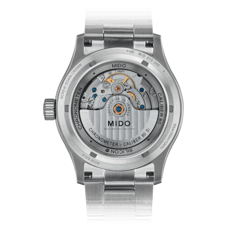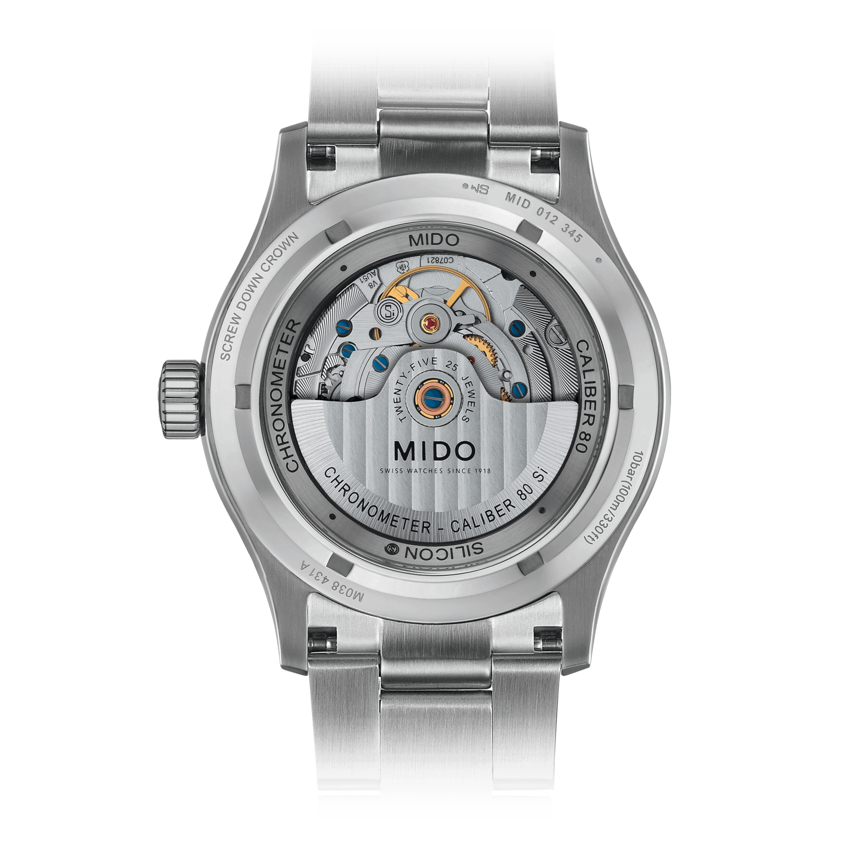 Il movimento MIDO Caliber 80 con cronometro di ultima generazione è dotato di una spirale in silicio. Oltre alle proprietà non amagnetiche, offre una maggior precisione e una resistenza agli urti maggiori. Assicura fino a 80 ore di autonomia.