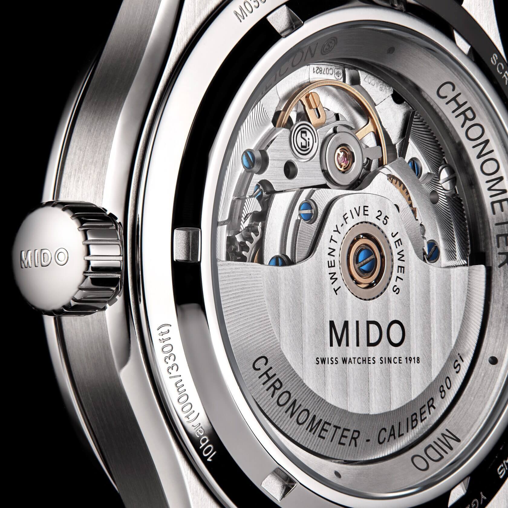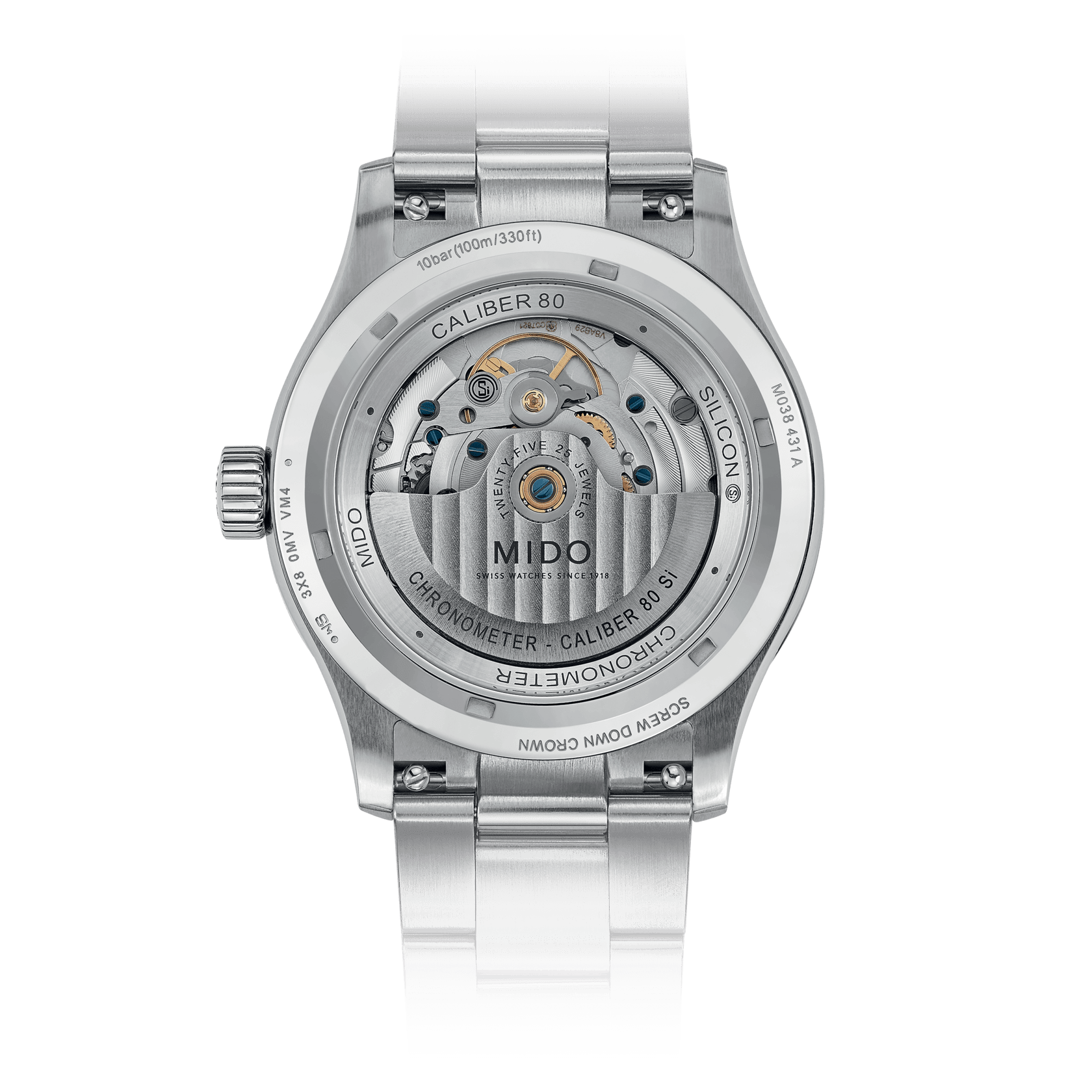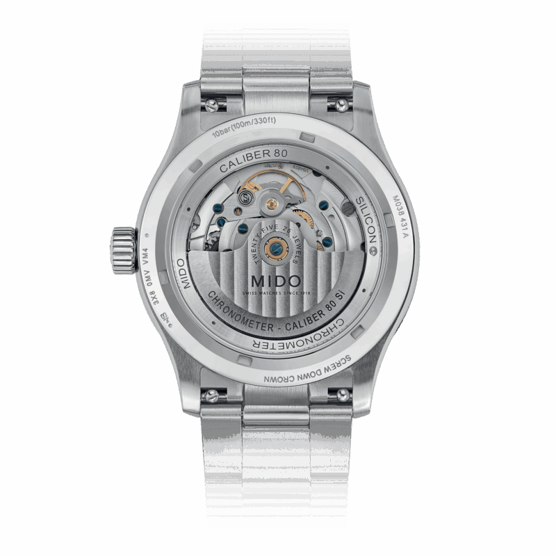 Il movimento MIDO Caliber 80 con cronometro di ultima generazione è dotato di una spirale in silicio. Oltre alle proprietà non amagnetiche, offre una maggior precisione e una resistenza agli urti maggiori. Assicura fino a 80 ore di autonomia.