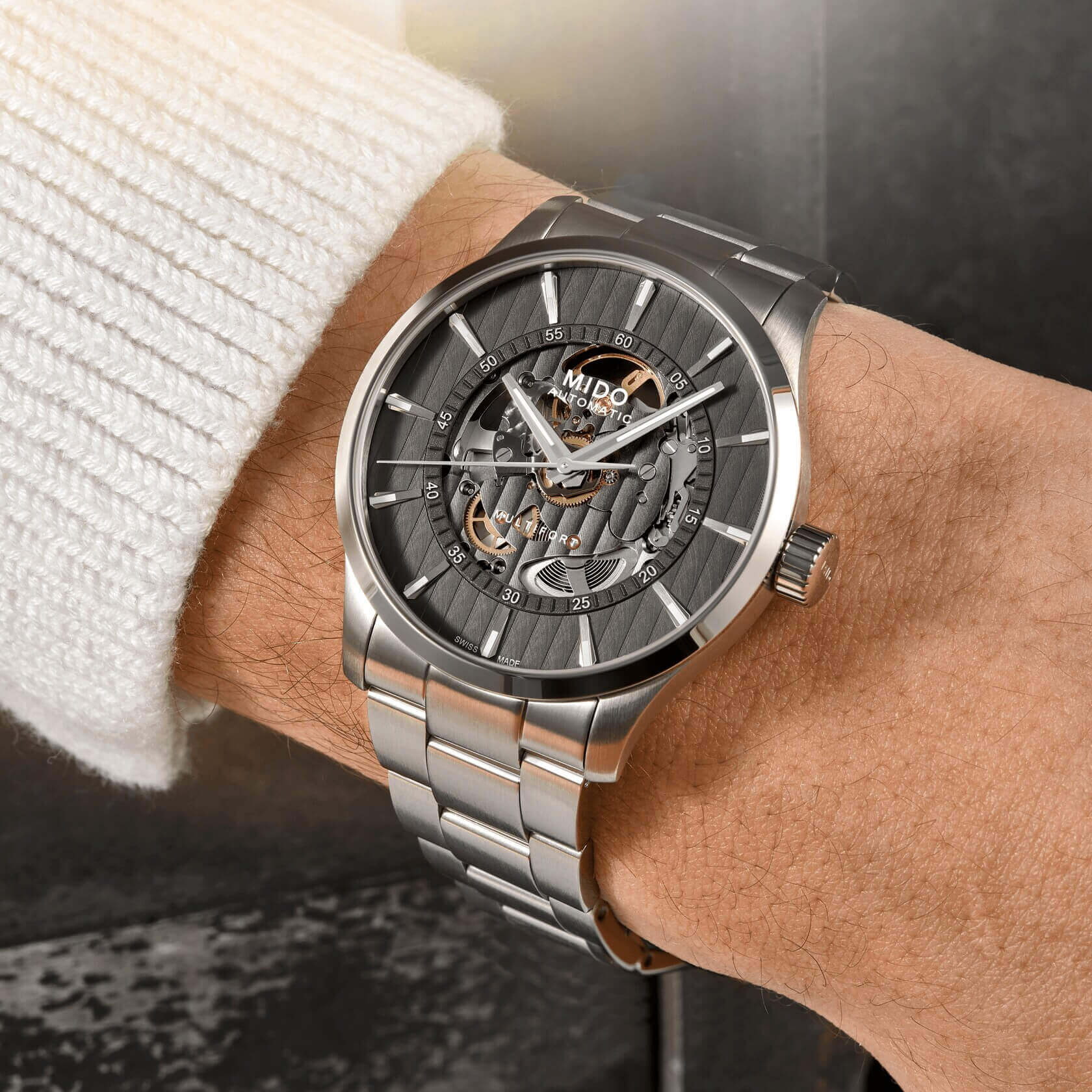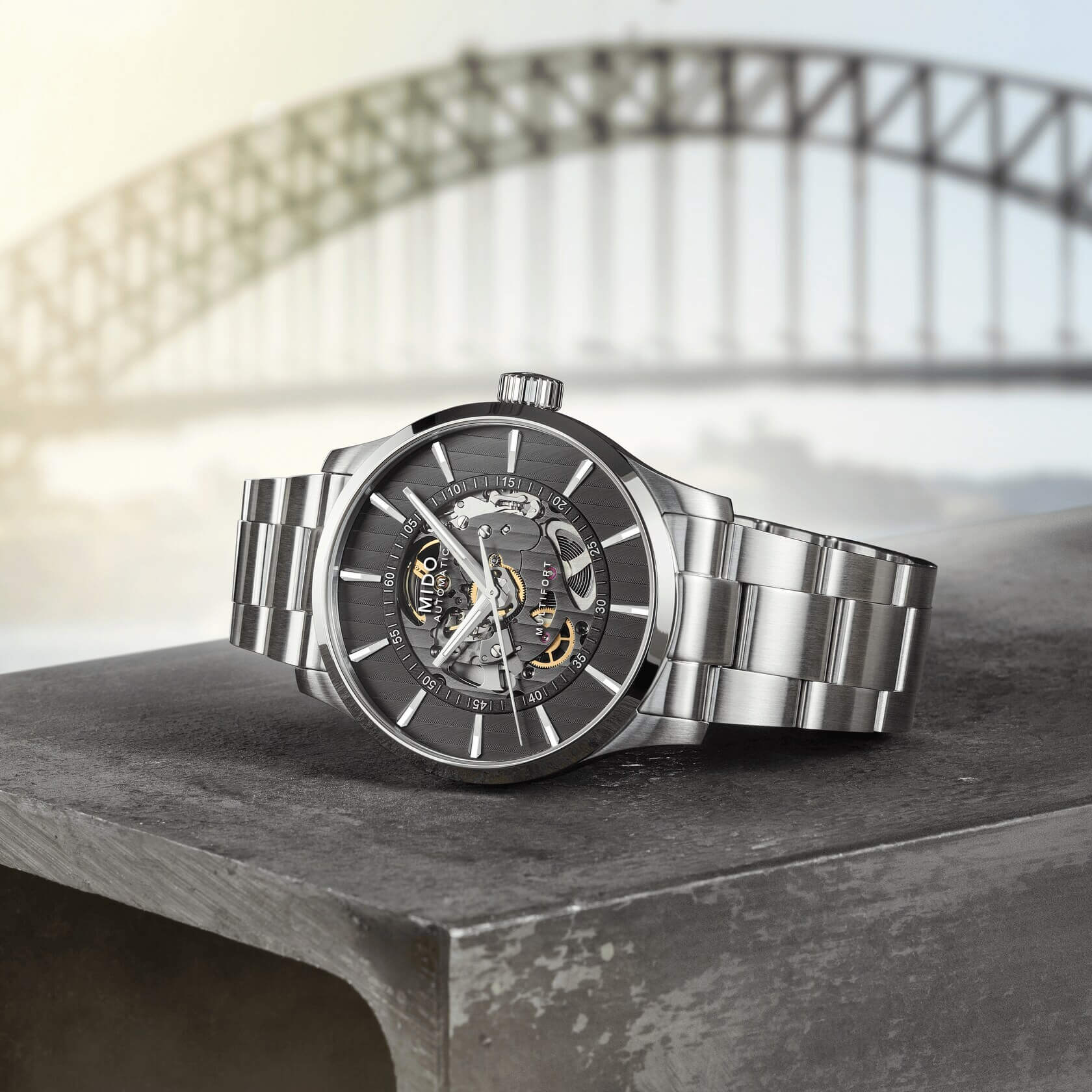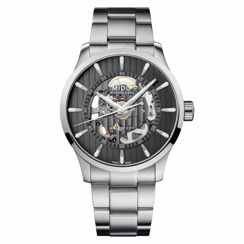 Con la sua estetica decisa e il meccanismo a vista, il MIDO Multifort Skeleton Vertigo ha un’allure decisamente audace. In una vera e propria conquista stilistica e tecnologica, questo modello mette in mostra il cuore del suo movimento automatico rivelando una platina finemente scheletrata. Il segnatempo mostra una forte influenza architettonica grazie alle Côtes de Genève – caratteristica di questa collezione ispirata all’ Harbour Bridge di Sydney – che adornano il suo quadrante color antracite. All’interno della robusta cassa in acciaio, il Calibro 80 ultraresistente, dotato di spirale Nivachron™, esibisce con orgoglio il suo ruotismo. La sua eccezionale autonomia dura fino a 80 ore, promettendo la massima precisione per conquistare la città senza fermarsi mai.