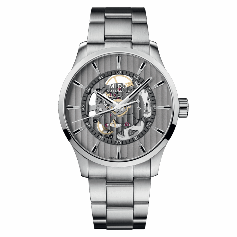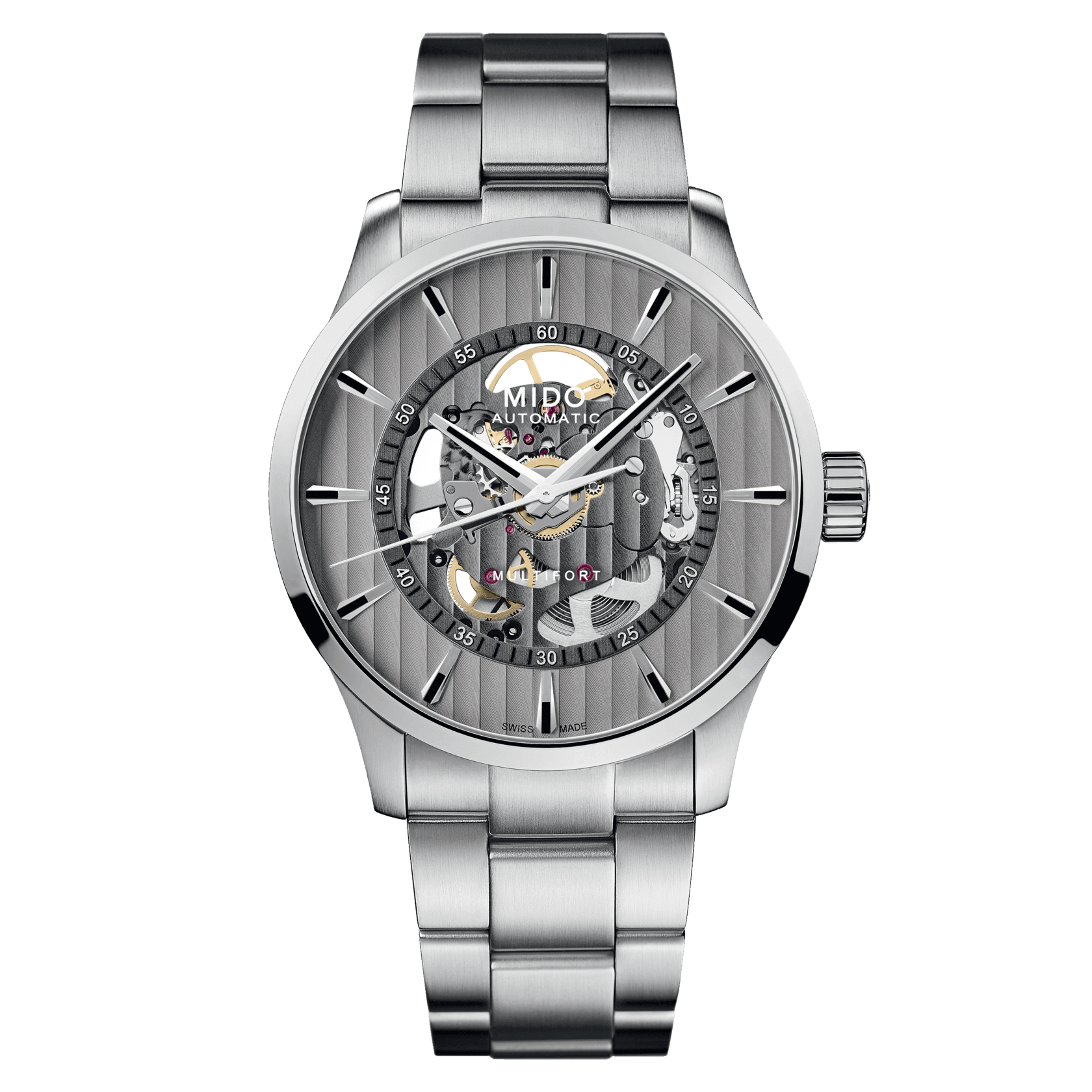 Con la sua estetica decisa e il meccanismo a vista, il MIDO Multifort Skeleton Vertigo ha un’allure decisamente audace. In una vera e propria conquista stilistica e tecnologica, questo modello mette in mostra il cuore del suo movimento automatico rivelando una platina finemente scheletrata. Il segnatempo mostra una forte influenza architettonica grazie alle Côtes de Genève – caratteristica di questa collezione ispirata all’ Harbour Bridge di Sydney – che adornano il suo quadrante color antracite. All’interno della robusta cassa in acciaio, il Calibro 80 ultraresistente, dotato di spirale Nivachron™, esibisce con orgoglio il suo ruotismo. La sua eccezionale autonomia dura fino a 80 ore, promettendo la massima precisione per conquistare la città senza fermarsi mai.