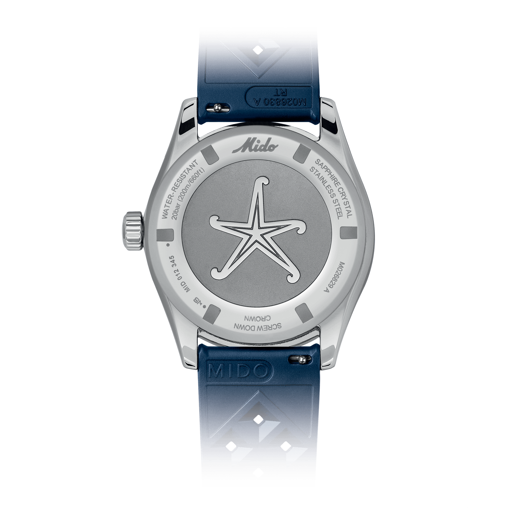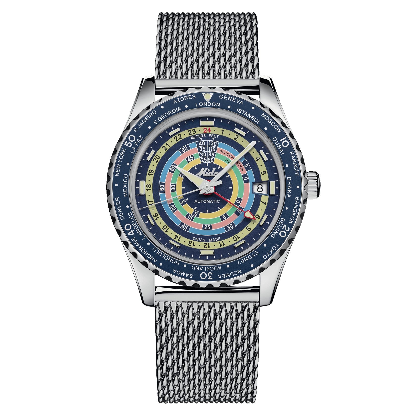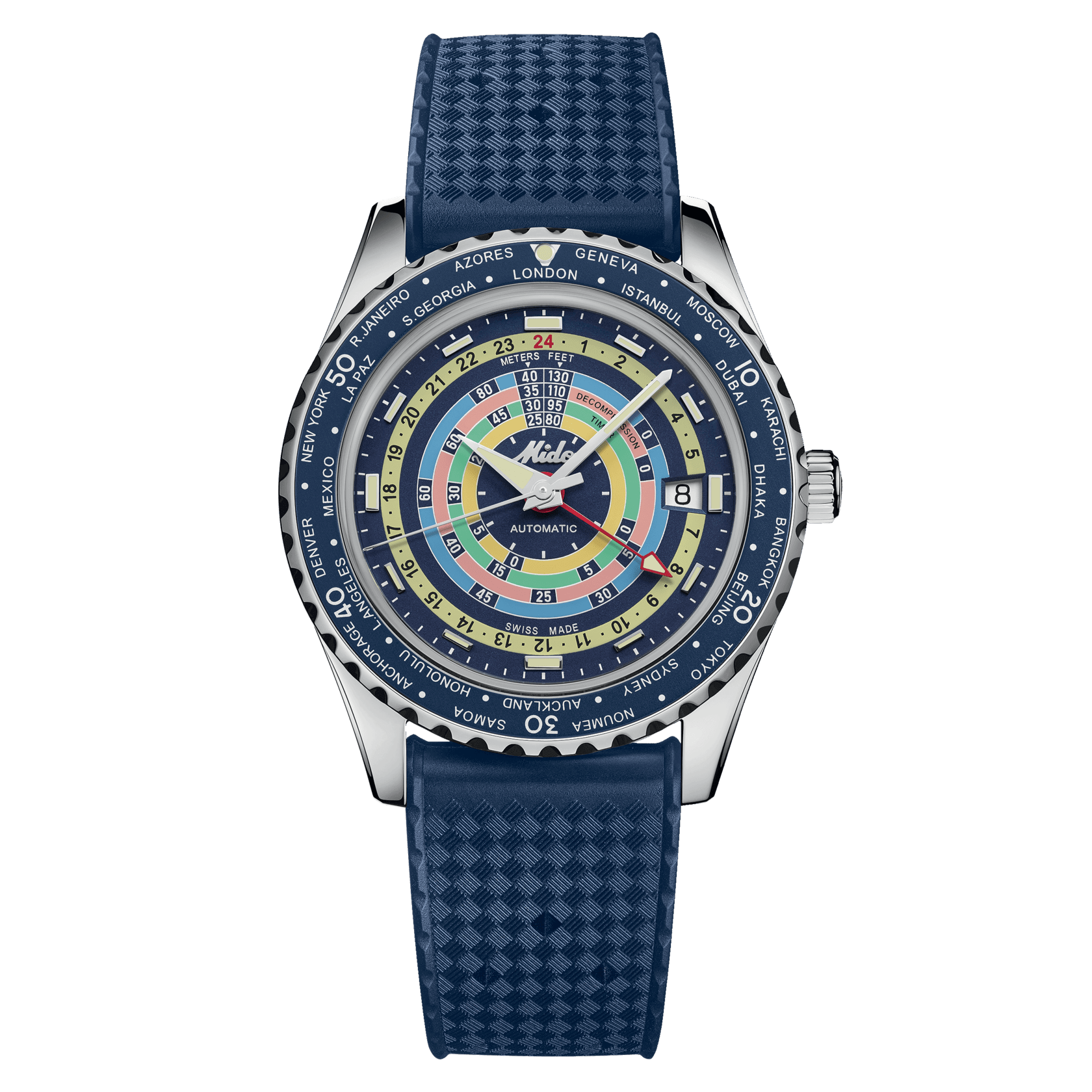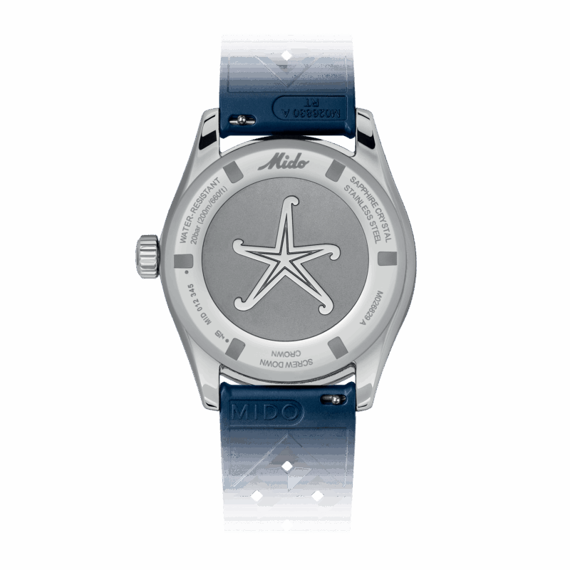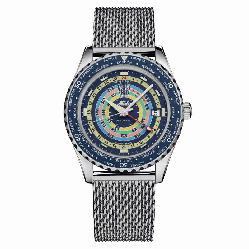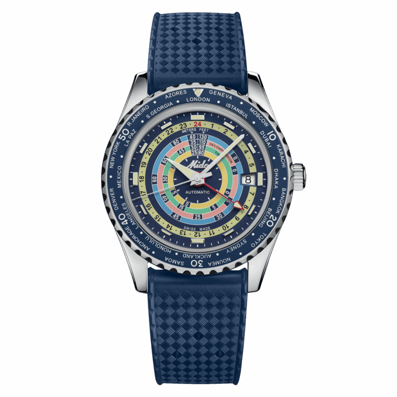 Irresistibile stile neo-vintage, colori vivaci e tecnologia all’avanguardia: il nuovo Ocean Star Decompression Worldtimer trasporterà gli intenditori verso nuovi orizzonti. Questo orologio automatico svizzero conserva il suo fascino vintage e l’aggiunta dell’indicazione di un fuso orario supplementare lo proietta verso nuovi orizzonti. MIDO ha utilizzato le più recenti tecnologie nella sua continua ricerca dell’eccellenza: Super-LumiNova®, vetro zaffiro stile glassbox, il formidabile Calibro 80 con spirale Nivachron™ e funzione GMT, nonché un cinturino aggiuntivo facilmente sostituibile. Una stella marina è incisa sul fondello a vite di questo nuovo modello, impermeabile fino a una pressione di 20 bar (200 m/660 ft).