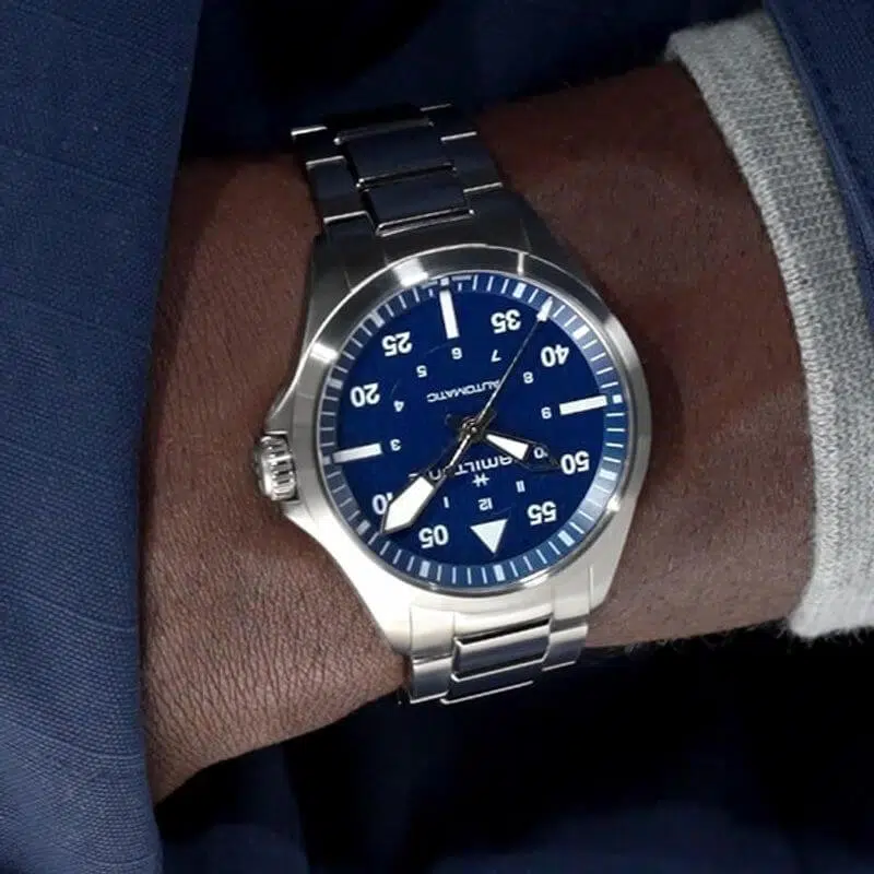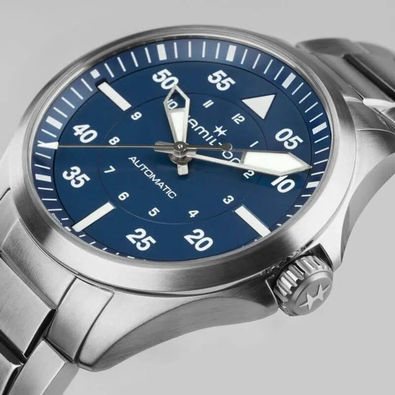 Realizzato pensando agli appassionati di aviazione, il Khaki Aviation Pilot richiama immediatamente lo spirito di esplorazione e di avventura del Khaki. Animato dal movimento automatico H-10 con riserva di carica di 80 ore e spirale in Nivachron™. Il Khaki Aviation 39 mm è completato da un bracciale sobrio in acciaio, abbinato a un quadrante blu scuro, per ricordare le infinite possibilità che offre il cielo.