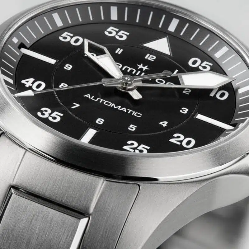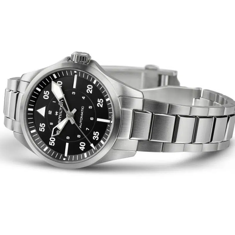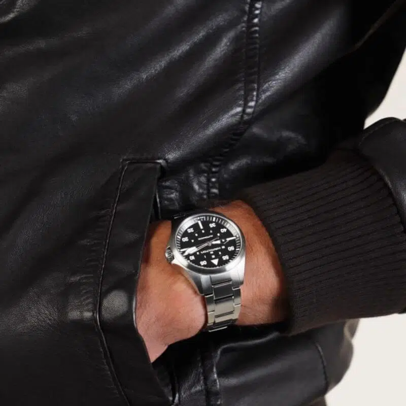 Realizzato pensando agli appassionati di aviazione, il Khaki Pilot Auto richiama immediatamente lo spirito di esplorazione e di avventura del Khaki. Alimentate dal movimento automatico H-10 con riserva di carica di 80 ore e spirale in Nivachron™, le versioni da 36 mm rispettano il trend di orologi più piccoli. Sebbene sempre rispettosi degli standard di precisione per la cabina di pilotaggio, questi design più compatti si prestano alla vita nei cieli ma anche sulla terraferma. Il Khaki Pilot Auto abbina un intramontabile bracciale in acciaio inossidabile e un quadrante di un nero affascinante, con rivestimento Super-LumiNova per una maggiore leggibilità.