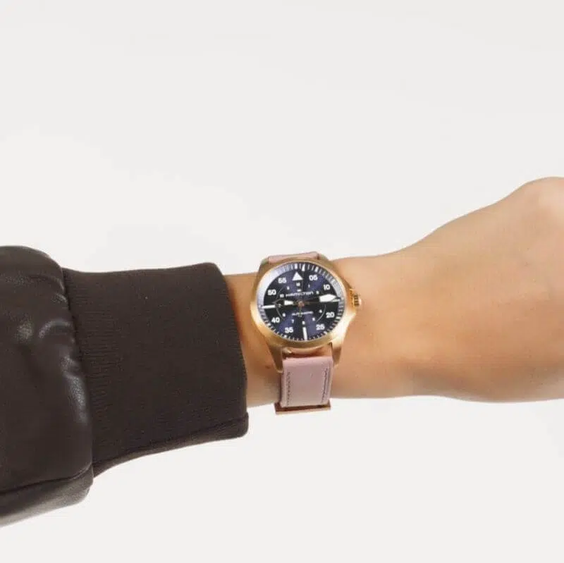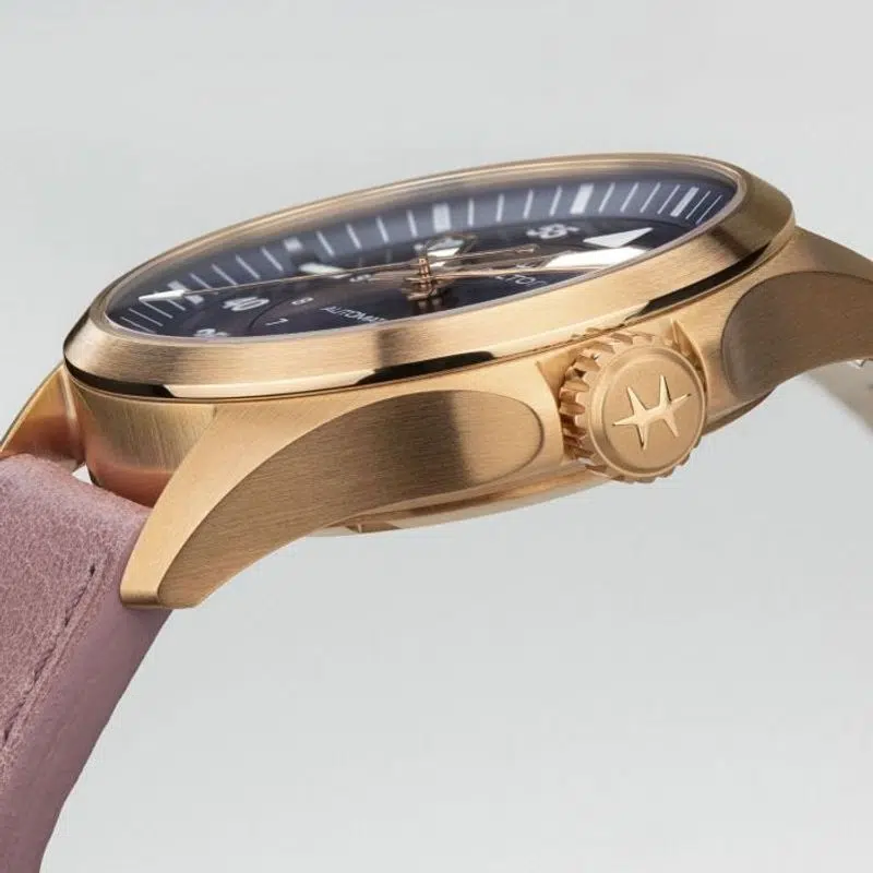 Realizzato pensando agli appassionati di aviazione, il Khaki Pilot Auto richiama immediatamente lo spirito di esplorazione e di avventura del Khaki. Alimentate dal movimento automatico H-10 con riserva di carica di 80 ore e spirale in Nivachron™, le versioni da 36 mm rispettano il trend di orologi più piccoli. Sebbene sempre rispettosi degli standard di precisione per la cabina di pilotaggio, questi design più compatti si prestano alla vita nei cieli ma anche sulla terraferma. Il Khaki Pilot Auto abbina un cinturino in pelle rosa a un quadrante blu mezzanotte e a uno speciale rivestimento in Super-LumiNova, per una maggiore leggibilità, custodito da una cassa elegante in acciaio inossidabile con rivestimento in PVD oro rosa.