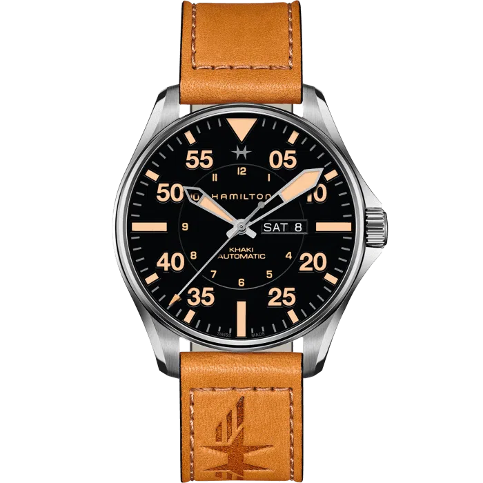 Questo orologio della dimensione di 46 mm è perfetto al polso di un pilota o di un aviatore urbano. Presenta una pratica funzione giorno e data, lancette e indici ultra leggibili in SuperLumiNova® e l’esclusivo movimento automatico H-30 che offre fino a 80 ore di riserva di carica. Nessun limite è insuperabile per questo orologio aeronautico dal carattere spiccatamente Hamilton.