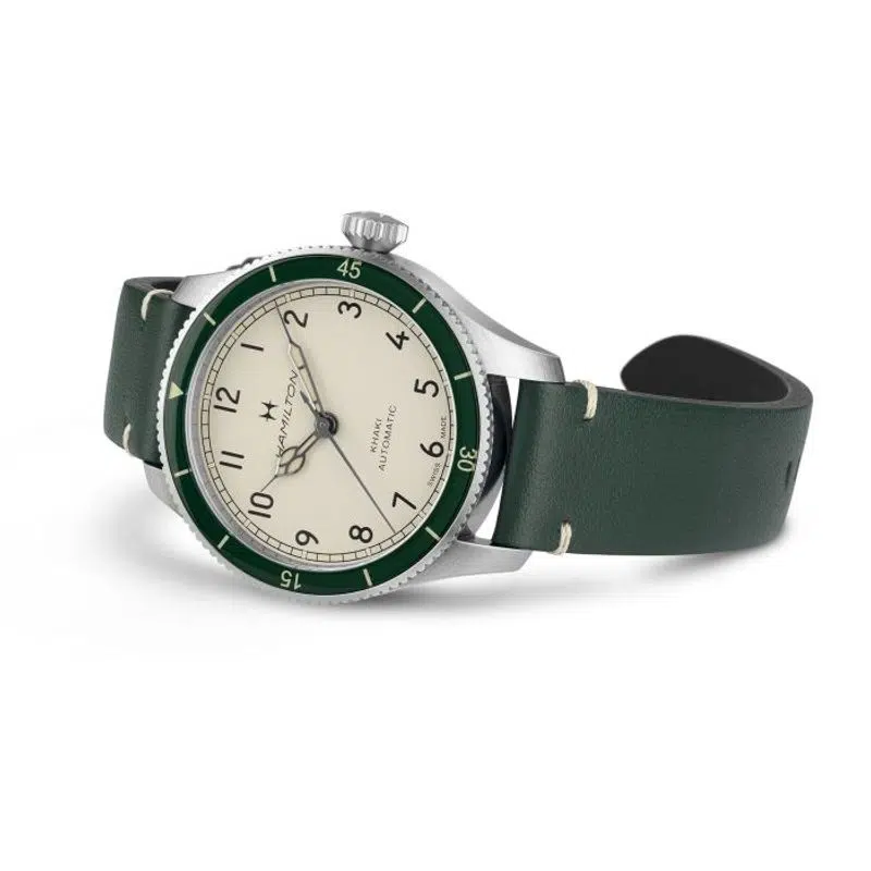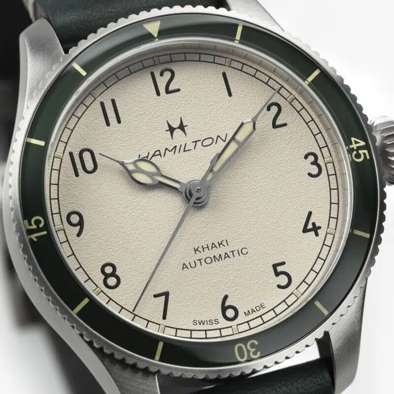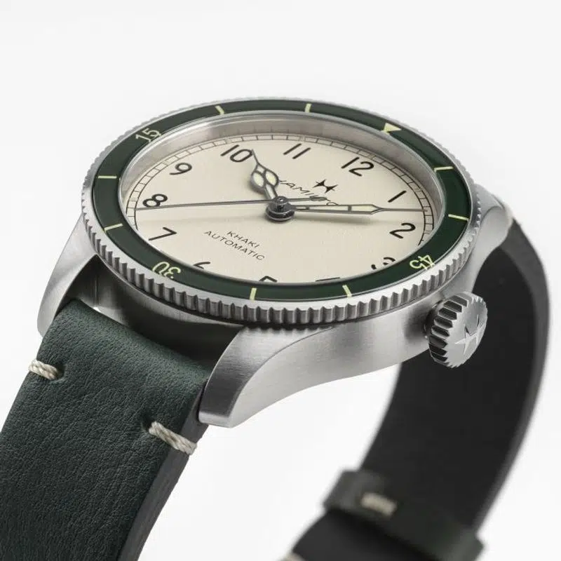 Con il suo caratteristico fascino rétro, il Khaki Pilot Pioneer Auto 38 mm continua a rendere omaggio alla ricca tradizione aeronautica e militare di Hamilton. Rivestito in verde muschio e dotato di una lunetta girevole colorata, è animato dal movimento H-10 con una riserva di carica di 80 ore. Un quadrante bianco guscio d’uovo e un cinturino in pelle verde conferiscono a questo orologio uno stile senza tempo.