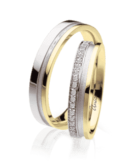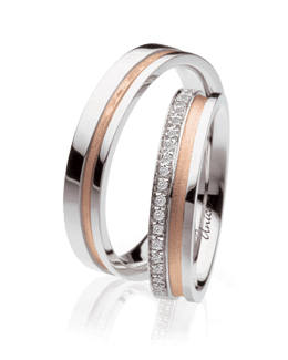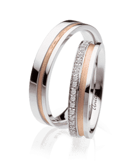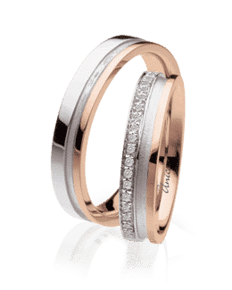 Una coppia di anelli molto elegante impreziosita, al femmilile, da un girodito di piccoli diamanti bianchi.