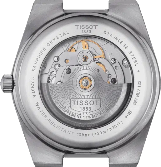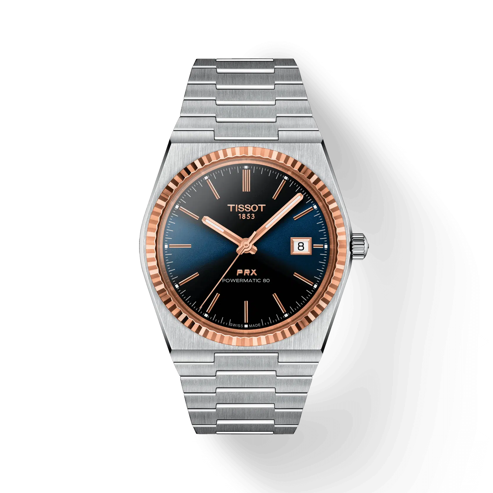 Nel 1978, Tissot ha creato un modello al quarzo con cassa sottile, indici stretti e bracciale in acciaio. La sua ampia ansa orizzontale, tipica dell’epoca, era perfettamente integrata nella cassa piatta a forma di tonneau. Pochi anni dopo, Tissot registrò il nome PRX. “PR” sta per “preciso” e “robusto”. La “X” sta per il numero romano dieci e per la pressione di 10 bar, che corrisponde ad una profondità di 100 metri, fino alla quale l’orologio è impermeabile. Nel 2021 Tissot lancia il nuovo PRX come moderna interpretazione del modello precedente. La cassa in acciaio inossidabile 316L del Tissot PRX ha un diametro di 40 mm. Ha una forma leggermente tonneau con una lunetta stretta e rotonda. Ai lati, finiture spazzolate verticalmente, arrotondate si alternano a sfaccettature lucide. Il Tissot PRX Powermatic 80 acciaio e oro 18 carati è dotato di una ghiera in oro rosa 18 carati che, insieme agli indici e alle lancette dello stesso colore, creano un piacevole contrasto con il quadrante blu. Le lancette del Tissot PRX Powermatic 80 acciaio e oro 18 carati sono dotate di un rivestimento SuperLumiNova® e sono posizionate una sopra l’altra con uno spazio molto piccolo. Ciò consente di avvicinare il quadrante al vetro dell’orologio. L’effetto ottico ottenuto dai designer Tissot fa apparire la cassa dell’orologio ancora più piatta e sottile di quanto non sia in realtà. Il Tissot PRX Powermatic 80 acciaio e oro 18 carati ha un vetro zaffiro antigraffio con rivestimento antiriflesso su entrambi i lati e un fondello in vetro minerale. Il tuo movimento automatico Swiss Made con una riserva di carica fino a 80 ore è dotato di una molla a spirale Nivachron, nota per l’eccellente sicurezza del campo magnetico. L’orologio ha un bracciale in acciaio inossidabile 316L.