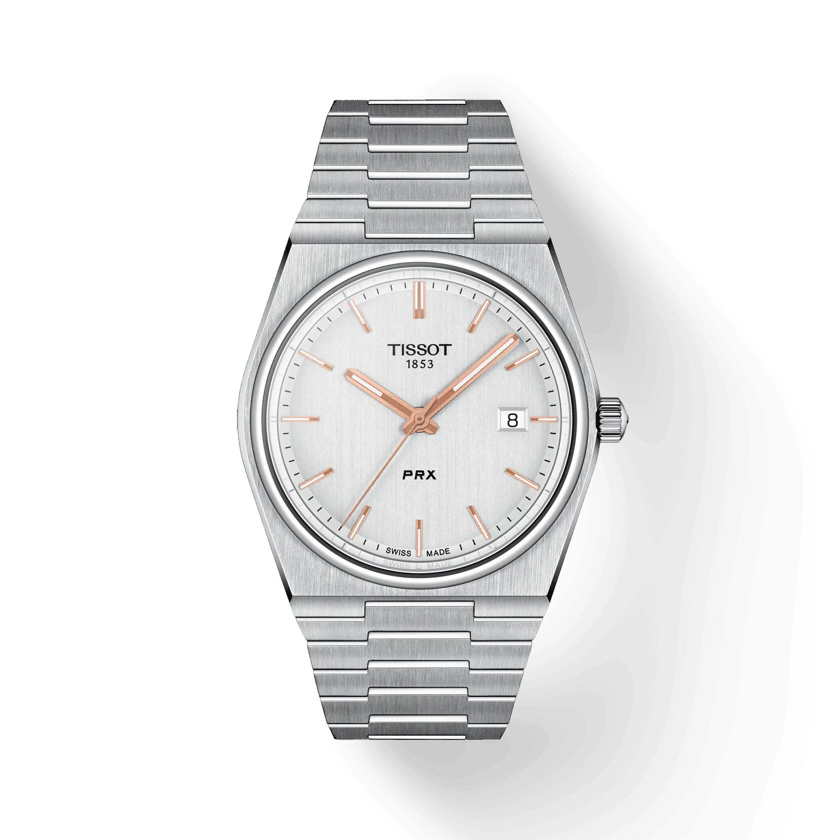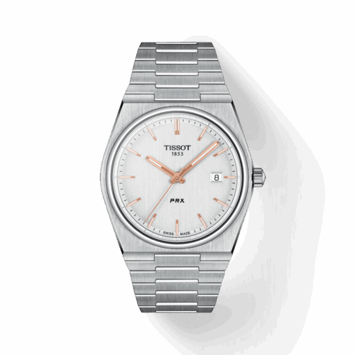 Nel 1978 Tissot creò un modello al quarzo, caratterizzato da una cassa sottile, indici stretti e un bracciale in acciaio. La sua ampia ansa orizzontale, tipica dell’epoca, era perfettamente integrata nella cassa piatta a forma di tonneau. Pochi anni dopo, Tissot ha registrato il nome PRX. “PR” sta per “preciso” e “robusto”. La “X” sta per il numero romano dieci e per la pressione di 10 bar che l’orologio è in grado di sopportare. Nel 2021 Tissot ha presentato il PRX 40205, È una versione moderna del modello precedente. La cassa in acciaio inossidabile 316L del Tissot PRX 40205 ha un diametro di 40 mm. Ha una forma leggermente tonneau ed è ornato da una lunetta stretta e rotonda. Ai lati, spazzolate verticalmente, finiture arrotondate si alternano a sfaccettature lucide. Il Tissot PRX 40205 Quartz è dotato di un quadrante con un motivo a raggiera nero o blu in combinazione con indici e lancette nichelati. Esiste anche una variante con quadrante grigio argento satinato con indici e lancette color oro rosa, una combinazione di colori che ricorda la fine degli anni ’70. La flessibilità e morbidezza delle maglie ne fanno un vero successo di design ergonomico e trasmettono uno straordinario comfort. Le lancette del PRX 40 205 sono dotate di un rivestimento SuperLumiNova® e sono posizionate l’una sull’altra con uno spazio minimo. Ciò consente di avvicinare il quadrante al vetro dell’orologio. L’effetto ottico ottenuto dai designer Tissot fa sembrare la cassa dell’orologio ancora più piatta e sottile di quanto non sia in realtà.