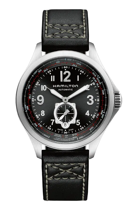 Il Khaki Aviation QNE inaugura nuovi orizzonti quanto a stile e funzionalità. Questo esclusivo segnatempo da 42 mm, dotato di scala per la rilevazione di pressione e altitudine, rappresenta l'accessorio ideale per piloti e aspiranti tali. Del resto, l'alfabeto aeronautico ‘Zulu’, inciso sul fondello, esclude qualsiasi rischio di equivoco con la torre di controllo o altri interlocutori di primaria importanza