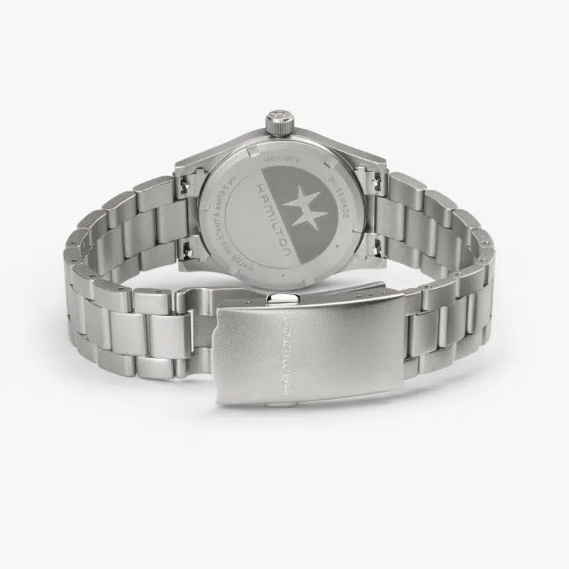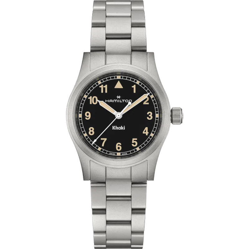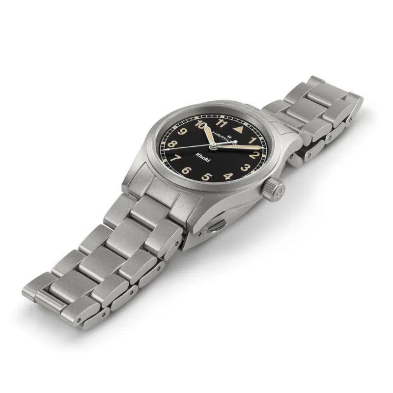 Perfetto per le tue avventure, il Khaki Field Quartz è un compagno affidabile e resistente, pronto per ogni esplorazione. Ispirato alla tradizione di precisione, innovazione e design funzionale di Hamilton, il Khaki Field Quartz combina un quadrante nero da 33 mm con un moderno bracciale in metallo, offrendo uno stile intramontabile.