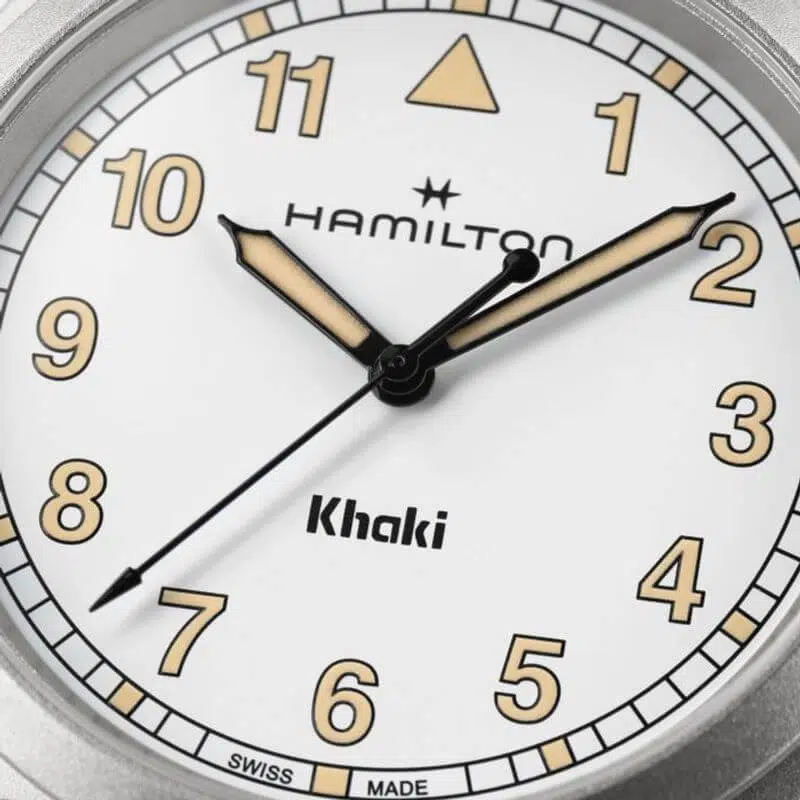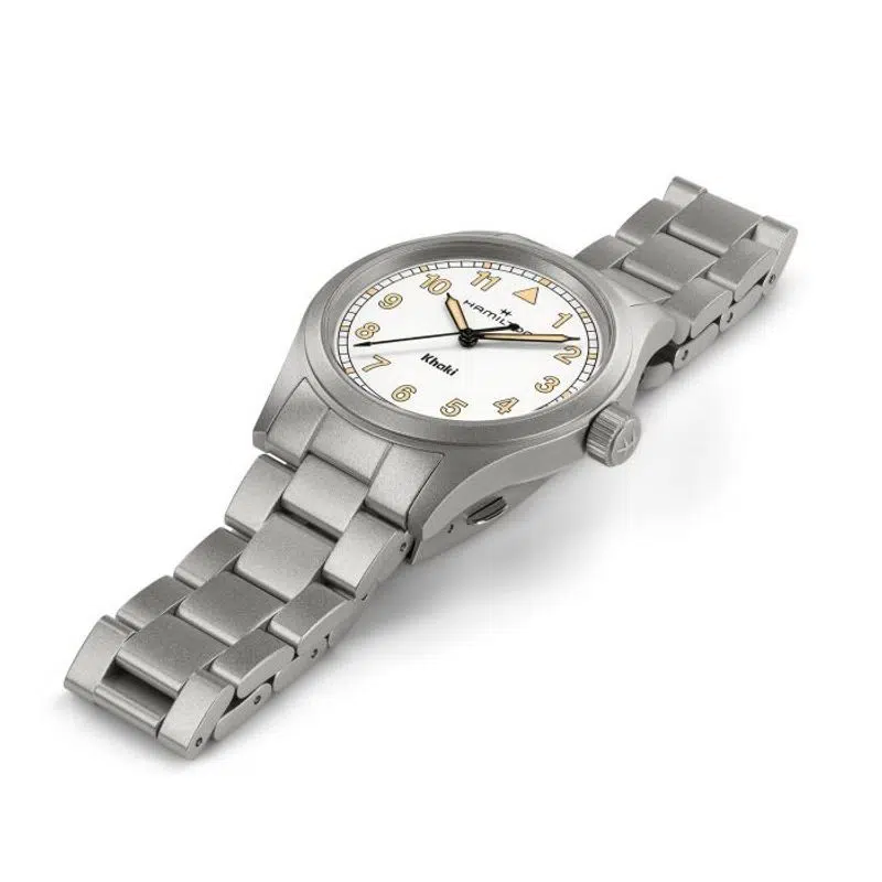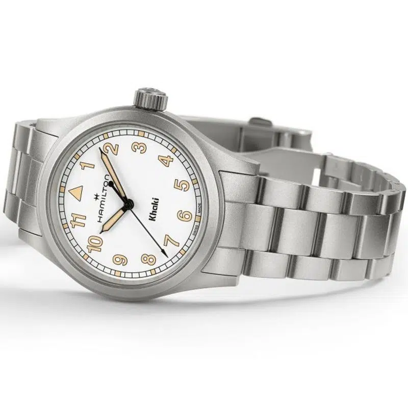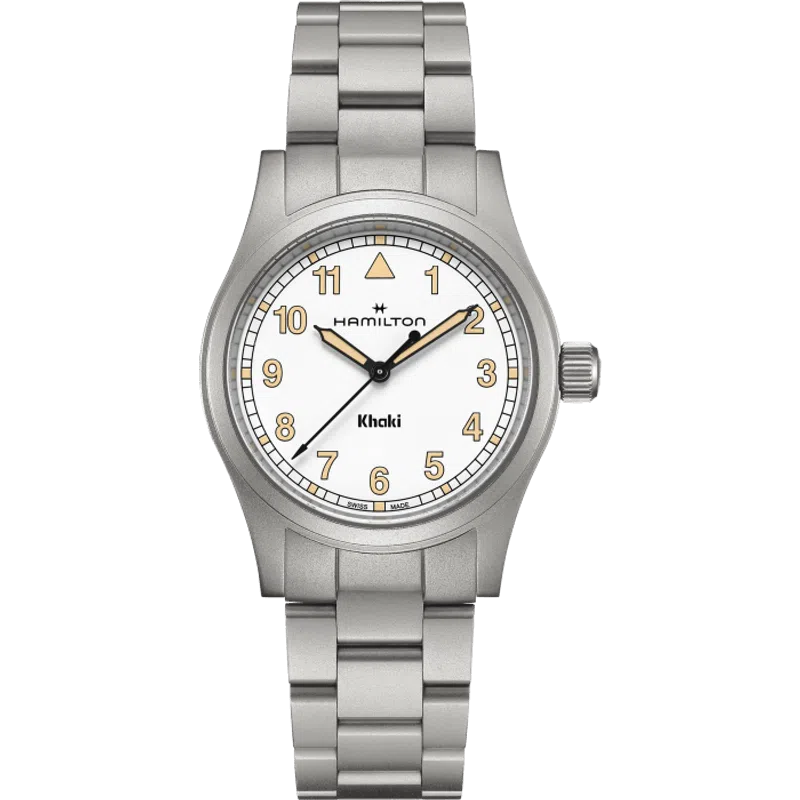 Perfetto per le tue avventure, il Khaki Field Quartz è un compagno affidabile e resistente, pronto per ogni esplorazione. Ispirato alla tradizione di precisione, innovazione e design funzionale di Hamilton, il Khaki Field Quartz combina un classico quadrante bianco da 38 mm con un moderno bracciale in metallo, offrendo uno stile intramontabile.