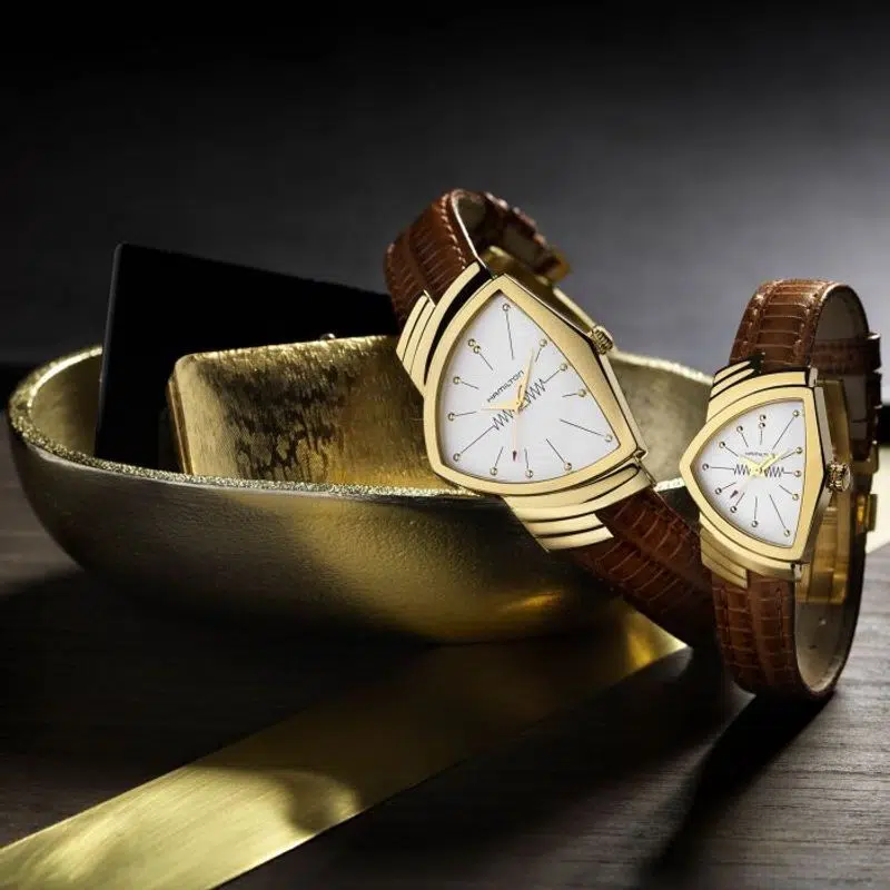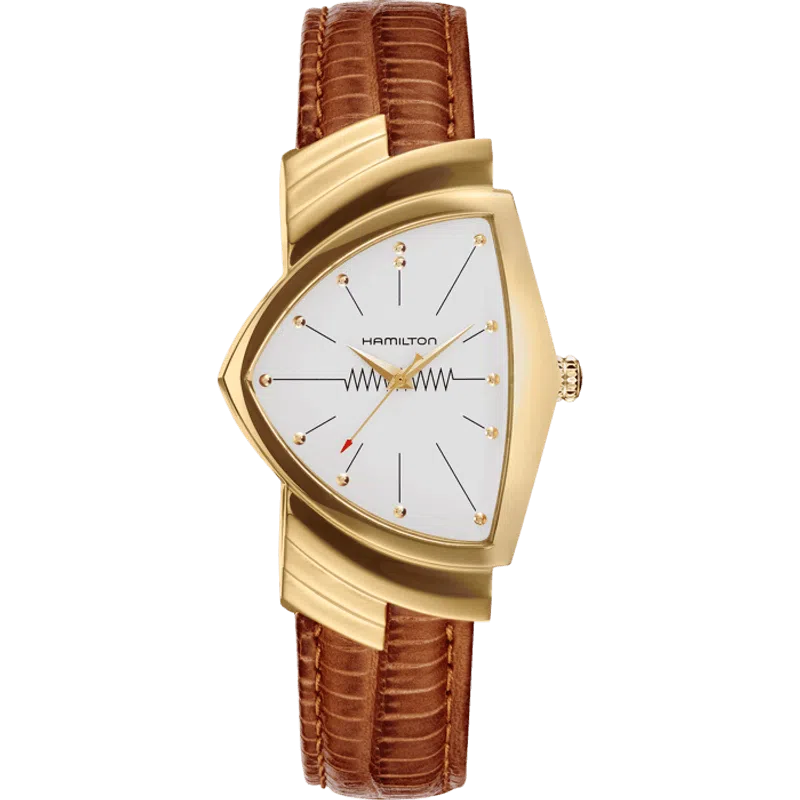 Il Ventura originale, presentato nel 1957, passò alla storia dell’orologeria come il primo orologio elettrico a batteria al mondo. Con il suo design unico e audace, divenne rapidamente un’icona e un oggetto da collezione. L’ultima interpretazione del Ventura è un fedele tributo all’originale e richiama la pionieristica forma a scudo della cassa, esempio di design moderno “Mid-Century”.