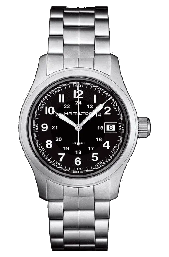 Orologio Hamilton con movimento al quarzo. La linea Khaki è perfetta per una vita all'aria aperta con quadrante nero in accio con cinturino in pelle. Questi orologi sono stati progettati per i più avventurosi Infatti ogni pezzo ha quadranti con indici colorati e chi lo indossa può scegliere tra il cinturino in pelle o i bracciali in acciaio inox.