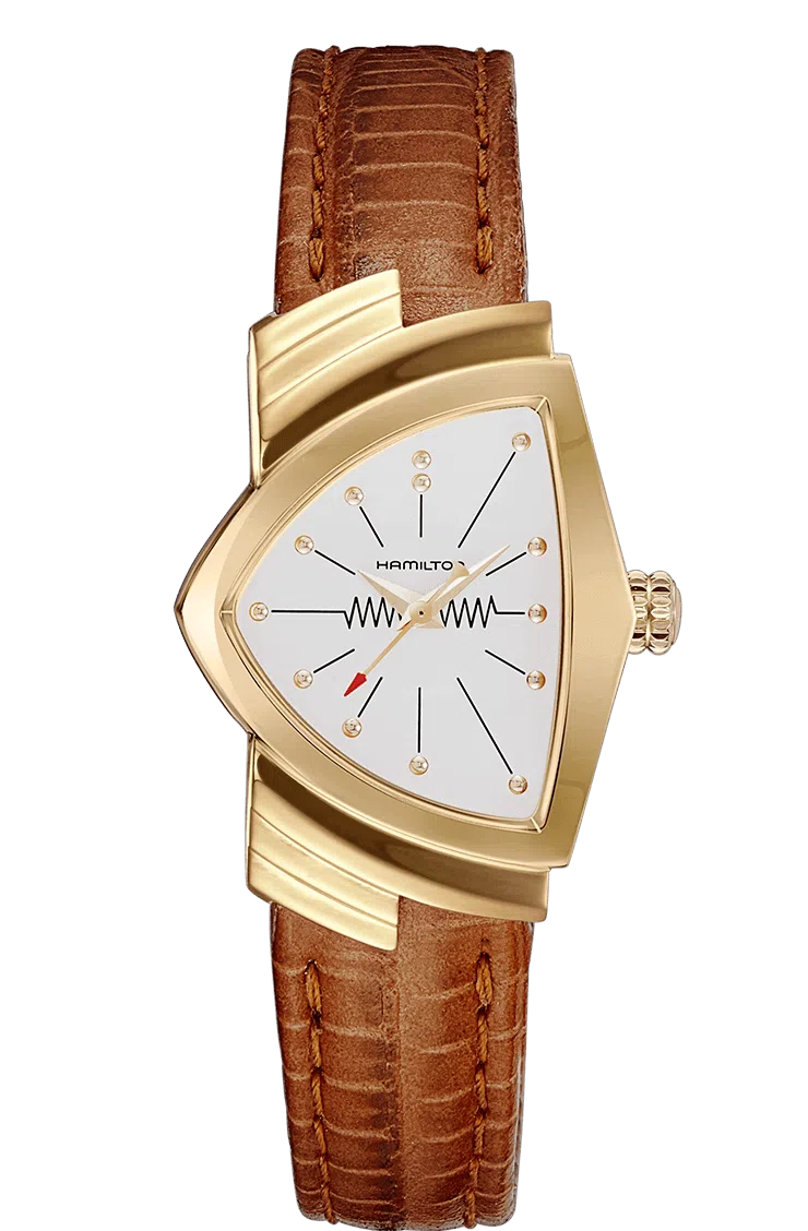 Orologio American Classic. Hamilton propone ancora una volta il suo orologio caratterizzante, lancetta dei secondi e cassa a scudo dorata e cinturino in pelle marrone. Hamilton monta movimenti esclusivamente di origine svizzera.