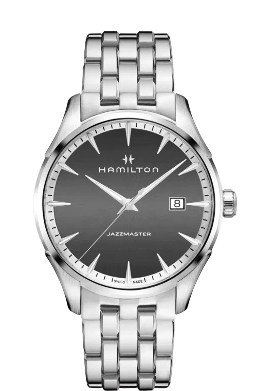 Semplice ed elegante con bracciale e cassa in acciaio, il tutto in abbinamento con il grigio del quadrante. Orologio da polso con movimento al quarzo e quadrante da 40mm. Orologio Hamilton della collezione Jazzmaster.