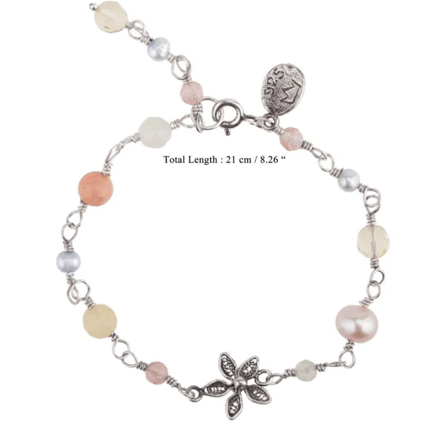Bracciale in argento con pietre naturali e perla rosa con fiore realizzato con il metodo della filigrana