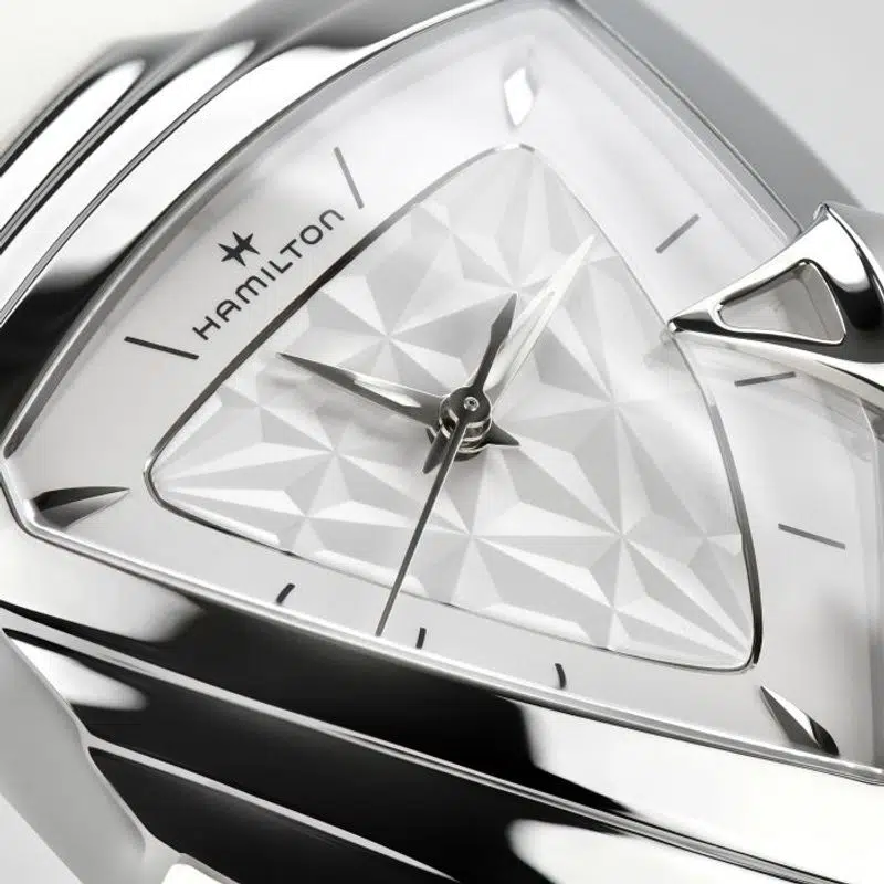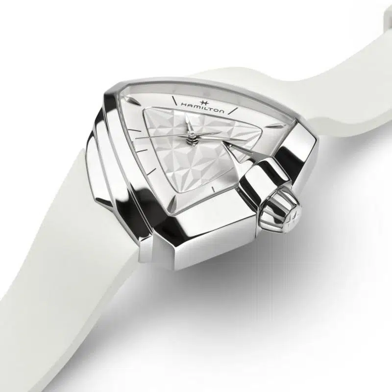 Più di cinquant’anni dopo, il primo orologio elettrico al mondo conserva un’estetica futuristica con la sua iconica cassa triangolare. Il Ventura S Quartz presenta un design ad effetto 3D su un quadrante nero o bianco completato da un cinturino in caucciù coordinato.