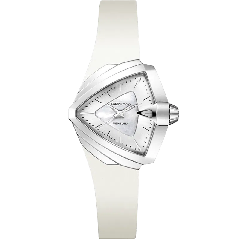 Il Ventura originale, presentato nel 1957, passò alla storia dell’orologeria come il primo orologio elettrico a batteria al mondo. Con il suo design unico e audace, divenne rapidamente un’icona e un oggetto da collezione. L’ultima interpretazione del Ventura è un fedele tributo all’originale e richiama la pionieristica forma a scudo della cassa, esempio di design moderno “Mid-Century”. Questa versione bianca e madreperla, piccola ma dalle proporzioni perfette, è stata progettata per donne dalla forte personalità.