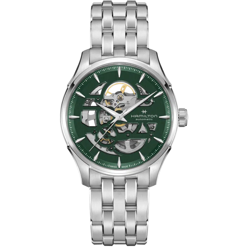 Connubio perfetto di tradizione e innovazione, il Jazzmaster Skeleton 40 mm permette di ammirare il movimento automatico svizzero in azione. Il quadrante scheletrato, con la sua straordinaria tonalità verde impero, rivela il movimento automatico H-10-S, con 25 rubini e un’impressionante riserva di carica di 80 ore. Questo iconico segnatempo è abbinato a un elegante bracciale in acciaio, che incarna dinamismo moderno e fascino intramontabile.