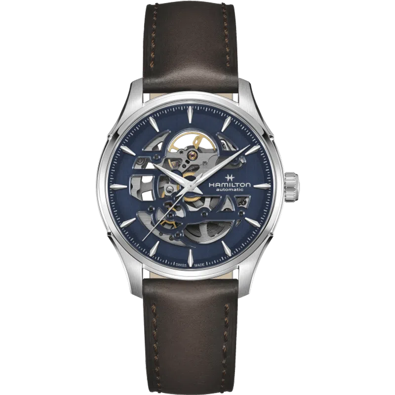 Il Jazzmaster Skeleton 36 mm, con il suo quadrante traforato blu, punta tutto sulla precisione e rivela al contempo la raffinata bellezza del movimento meccanico al suo interno. Mettendo in risalto il movimento automatico H-10, con una riserva di carica di 80 ore e spirale in Nivachron™, il Jazzmaster Skeleton vanta un sofisticato cinturino in pelle marrone, che incarna il savoir-faire in continua evoluzione di Hamilton e l’attenzione ai dettagli.