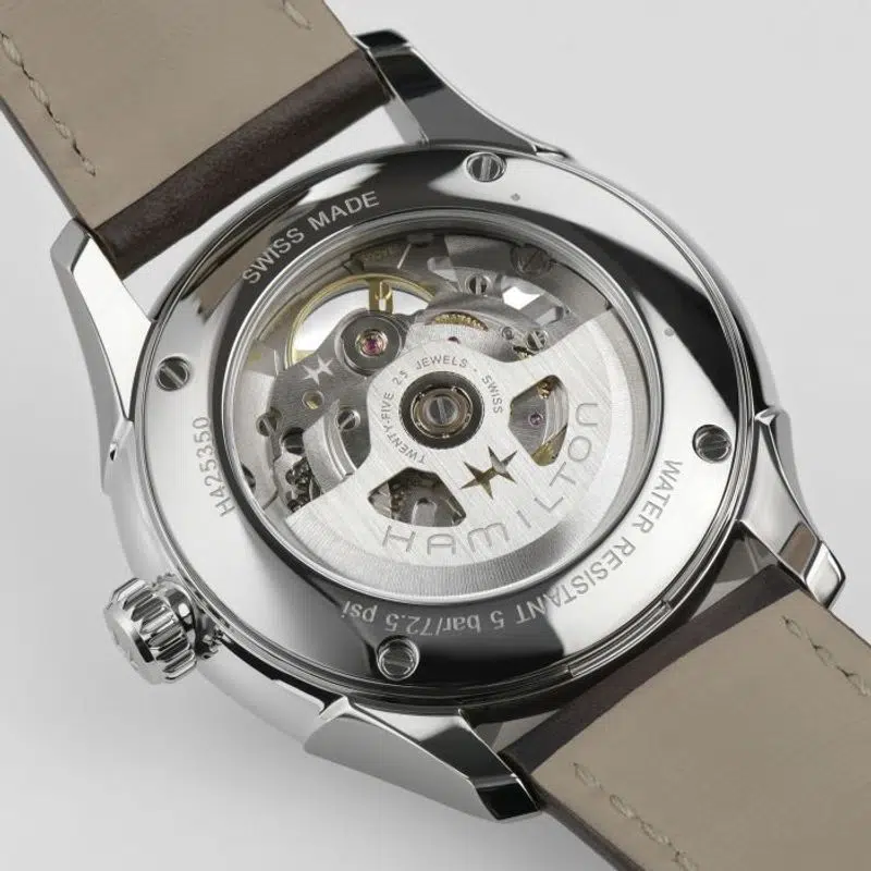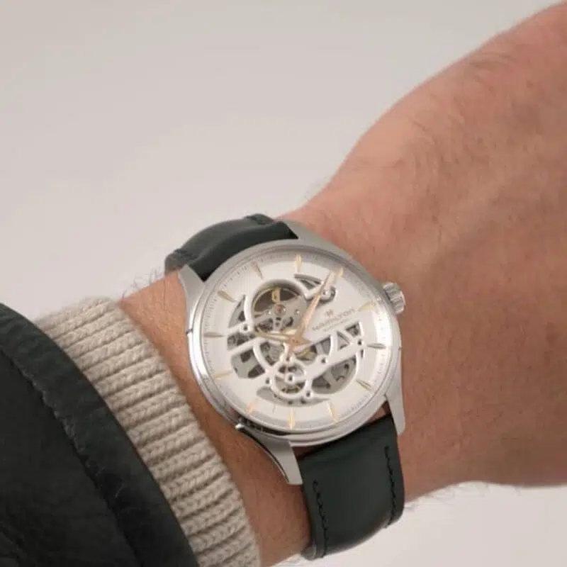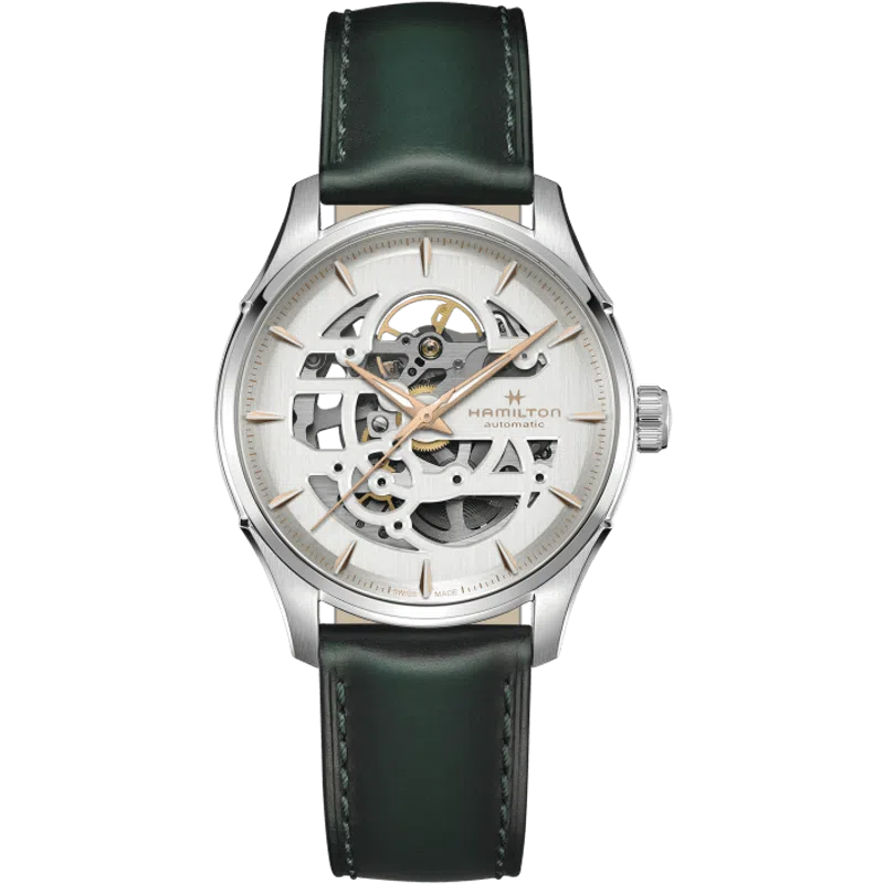 Il Jazzmaster Skeleton 40 mm, con il suo quadrante traforato argento, punta tutto sulla precisione e rivela al contempo la raffinata bellezza del movimento meccanico al suo interno. Mettendo in risalto il movimento automatico H-10, con una riserva di carica di 80 ore e spirale in Nivachron™, il Jazzmaster Skeleton vanta un sofisticato cinturino in pelle verde, che incarna il savoir-faire in continua evoluzione di Hamilton e l’attenzione ai dettagli.