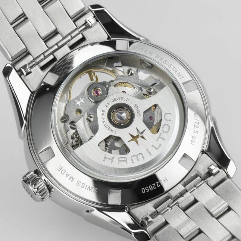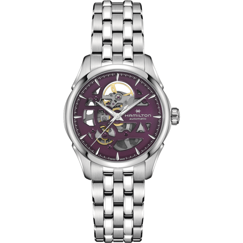 Il Jazzmaster Skeleton 36 mm, con il suo quadrante traforato viola, punta tutto sulla precisione e rivela al contempo la raffinata bellezza del movimento meccanico al suo interno. Mettendo in risalto il movimento automatico H-10, con una riserva di carica di 80 ore e spirale in Nivachron™, il Jazzmaster Skeleton vanta un sofisticato bracciale in acciaio, che incarna il savoir-faire in continua evoluzione di Hamilton e l’attenzione ai dettagli.