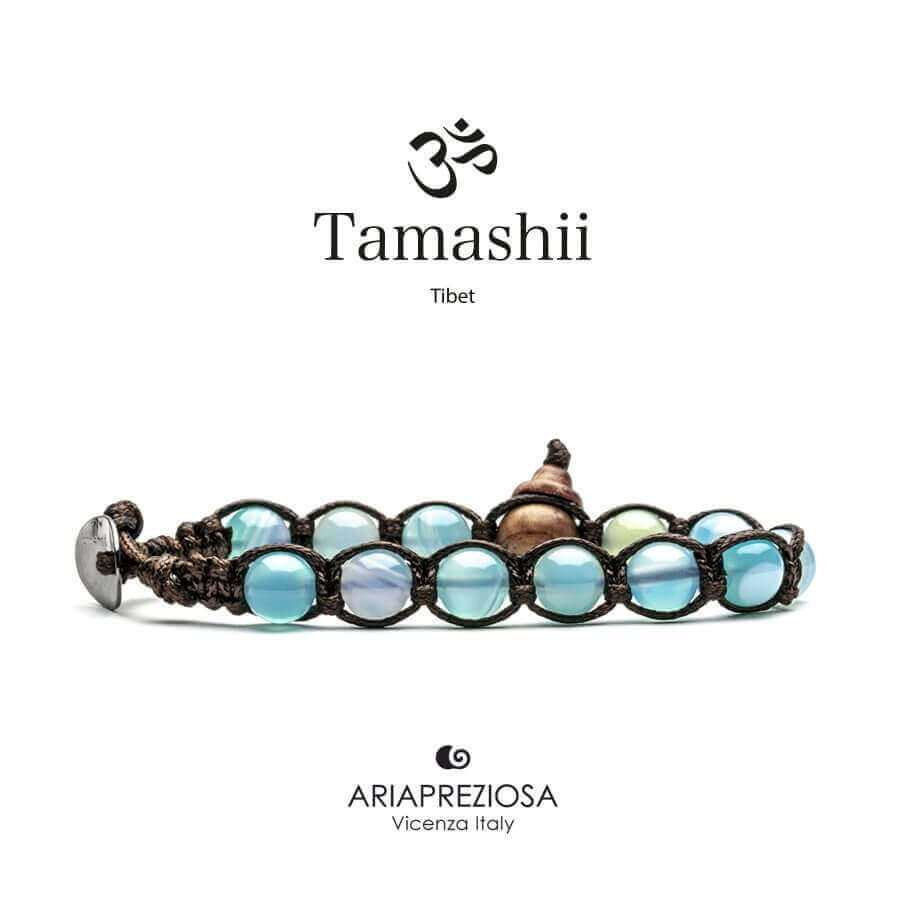 Bracciale originale tibetano Tamashii realizzato con pietre naturali AGATA AZZURRA (SKY) STRIATA.