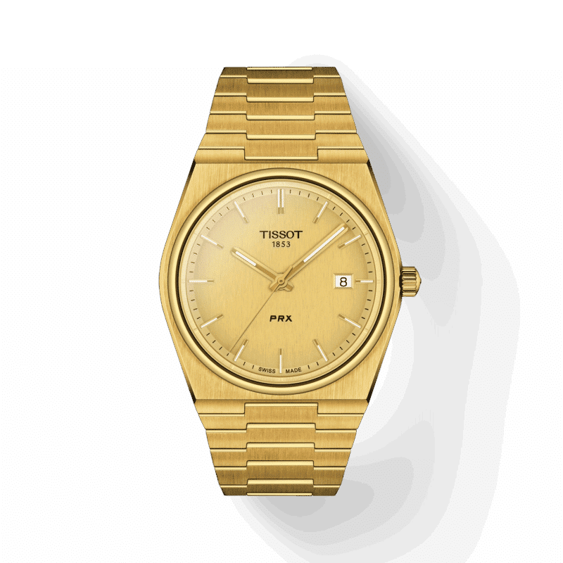 Nel 1978 Tissot creò un modello al quarzo, caratterizzato da una cassa sottile, indici stretti e un bracciale in acciaio. La sua ampia ansa orizzontale, tipica dell’epoca, era perfettamente integrata nella cassa piatta a forma di tonneau. Pochi anni dopo, Tissot ha registrato il nome PRX. “PR” sta per “preciso” e “robusto”. La “X” sta per il numero romano dieci e per la pressione di 10 bar che l’orologio è in grado di sopportare. Nel 2021 Tissot ha presentato il PRX 40205, È una versione moderna del modello precedente. La cassa in acciaio inossidabile 316L del Tissot PRX 40205 ha un diametro di 40 mm. Ha una forma leggermente tonneau ed è ornato da una lunetta stretta e rotonda. Ai lati, spazzolate verticalmente, finiture arrotondate si alternano a sfaccettature lucide. Il Tissot PRX 40205 Quartz è dotato di un quadrante con un motivo a raggiera nero o blu in combinazione con indici e lancette nichelati. Esiste anche una variante con quadrante grigio argento satinato con indici e lancette color oro rosa, una combinazione di colori che ricorda la fine degli anni ’70. La flessibilità e morbidezza delle maglie ne fanno un vero successo di design ergonomico e trasmettono uno straordinario comfort. Le lancette del PRX 40 205 sono dotate di un rivestimento SuperLumiNova® e sono posizionate l’una sull’altra con uno spazio minimo. Ciò consente di avvicinare il quadrante al vetro dell’orologio. L’effetto ottico ottenuto dai designer Tissot fa sembrare la cassa dell’orologio ancora più piatta e sottile di quanto non sia in realtà.