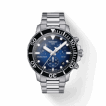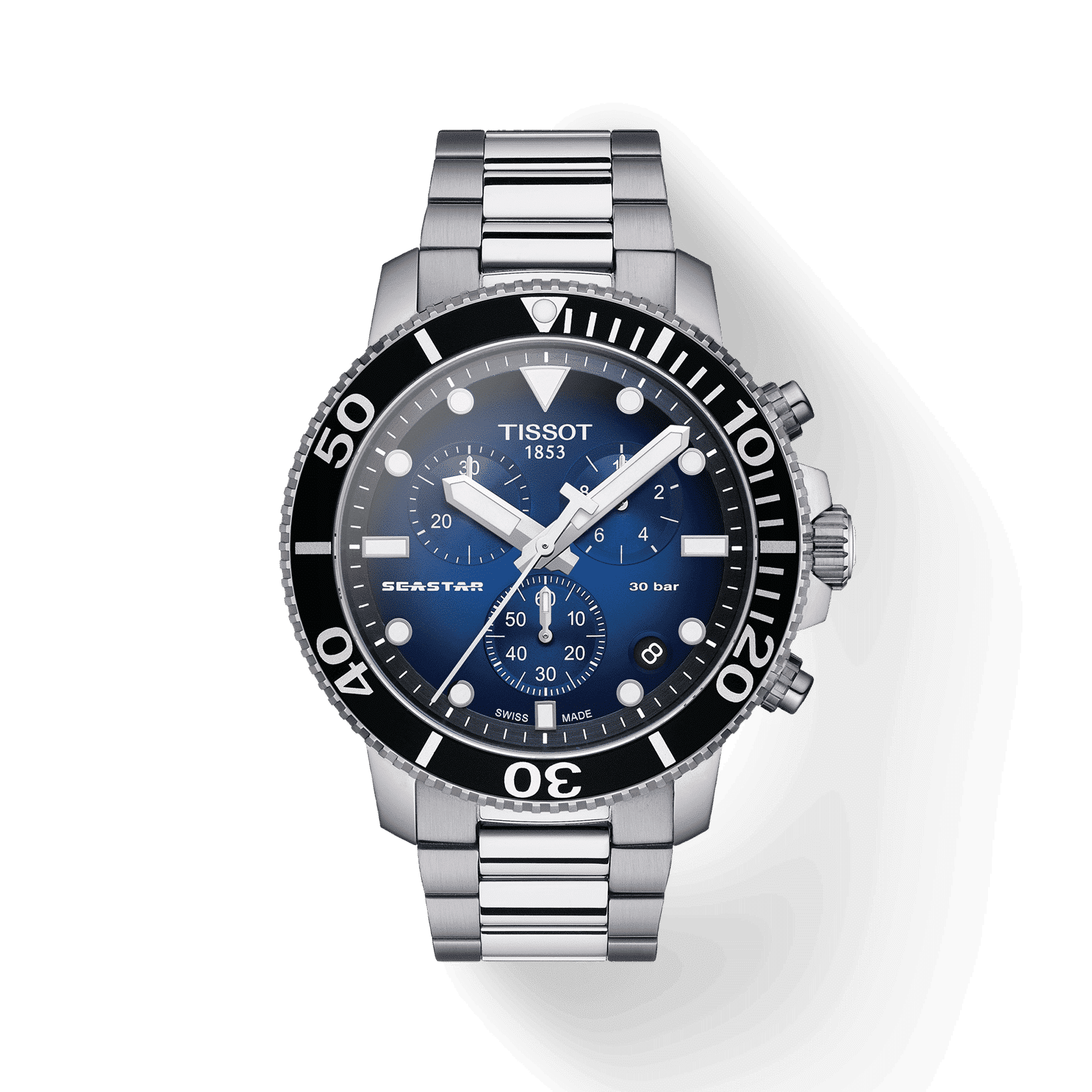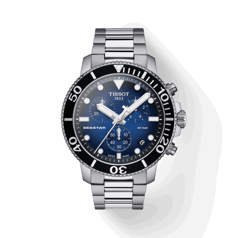 • Il Tissot Seastar 1000 è l’orologio per gli amanti del mare per eccellenza grazie all’elevata impermeabilità fino a 30 bar (300 m/1.000 ft), al binomio fondello e corona a vite e ad una lunetta unidirezionale in ceramica. Il modello monta un movimento automatico.