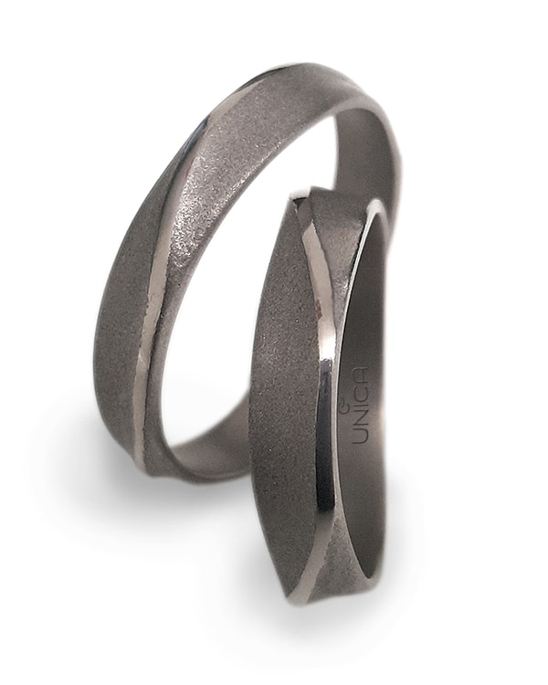 Anelli realizzati interamente in titanio con una forma avvolgente e sinuosa, leggermente ritorta, come il simbolo dell’infinito. Sempre uguale e sempre diversa quando la si ruota attorno al dito.