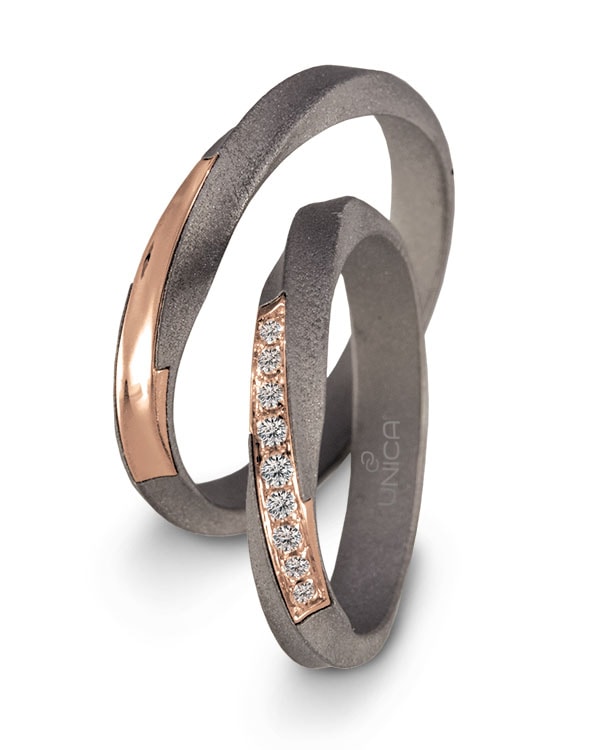 Fedi nuziali in titanio con inserto in oro. Il profilo leggermente ritorto sul lato anteriore trasforma la fede della tradizione in un gioiello dal design contemporaneo. Per lei illuminata da un pav� di piccoli diamanti.