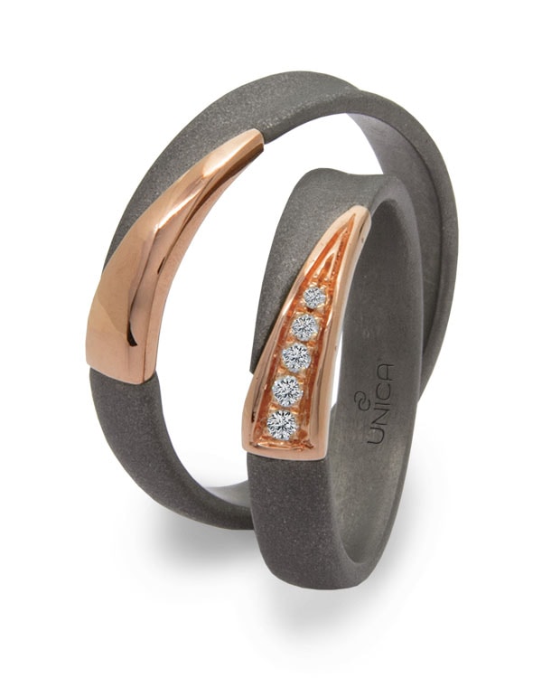 I due colori dell’oro si uniscono per dare forma a queste fedi nuziali caratterizzate dalla contrapposizione degli opposti: lucido e opaco, concavo e convesso.